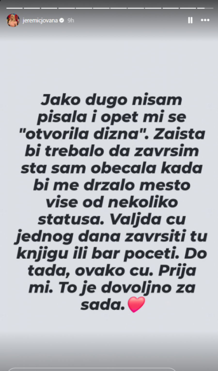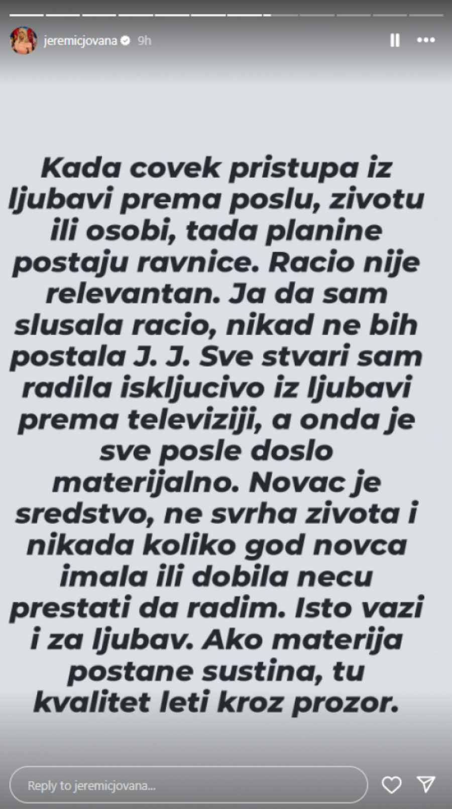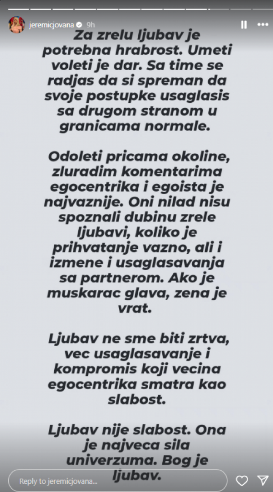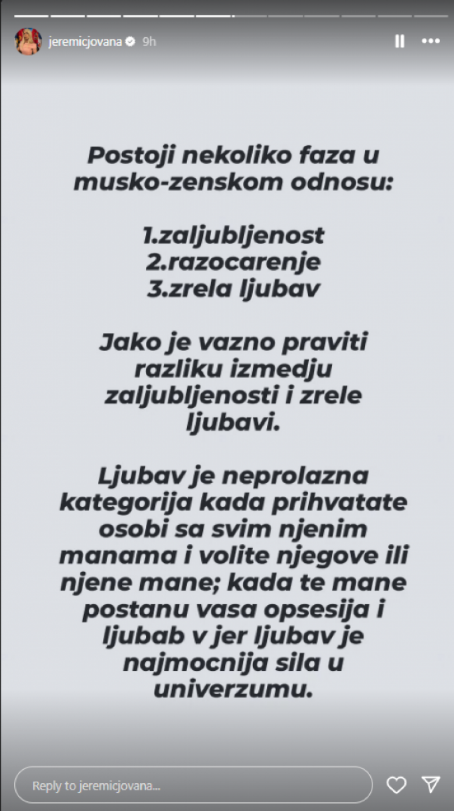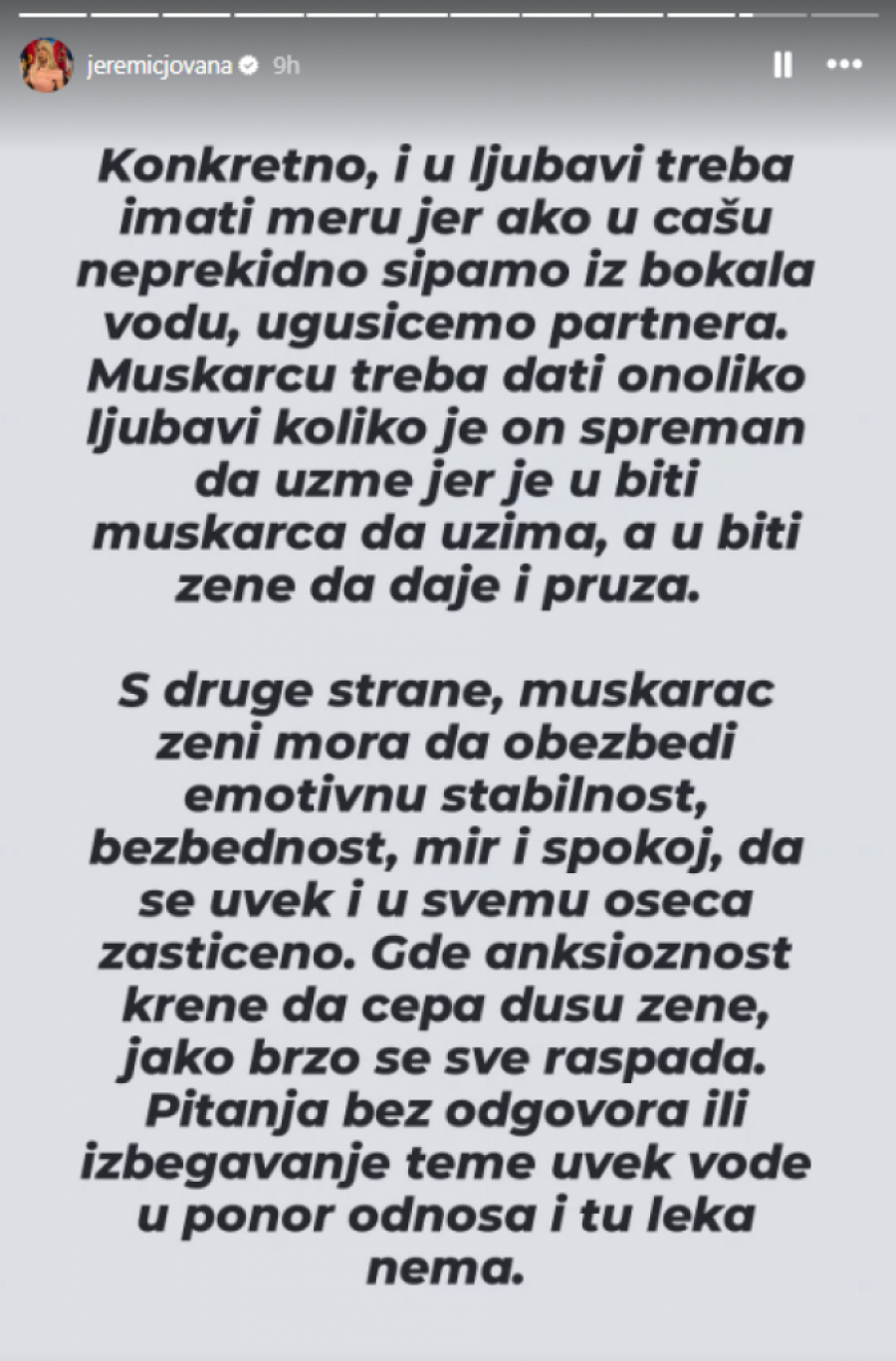 Popularna voditeljka Jovana Jeremić je sinoć iznenadila fanove storijima na društvenoj mreži Instagram u kojima se osvrnula na muško-ženske odnose, zbog čega su mnogi pomislili da ih je posvetila upravo Draganu Stankoviću, sa kojim je raskinula pre nešto više od mesec dana.