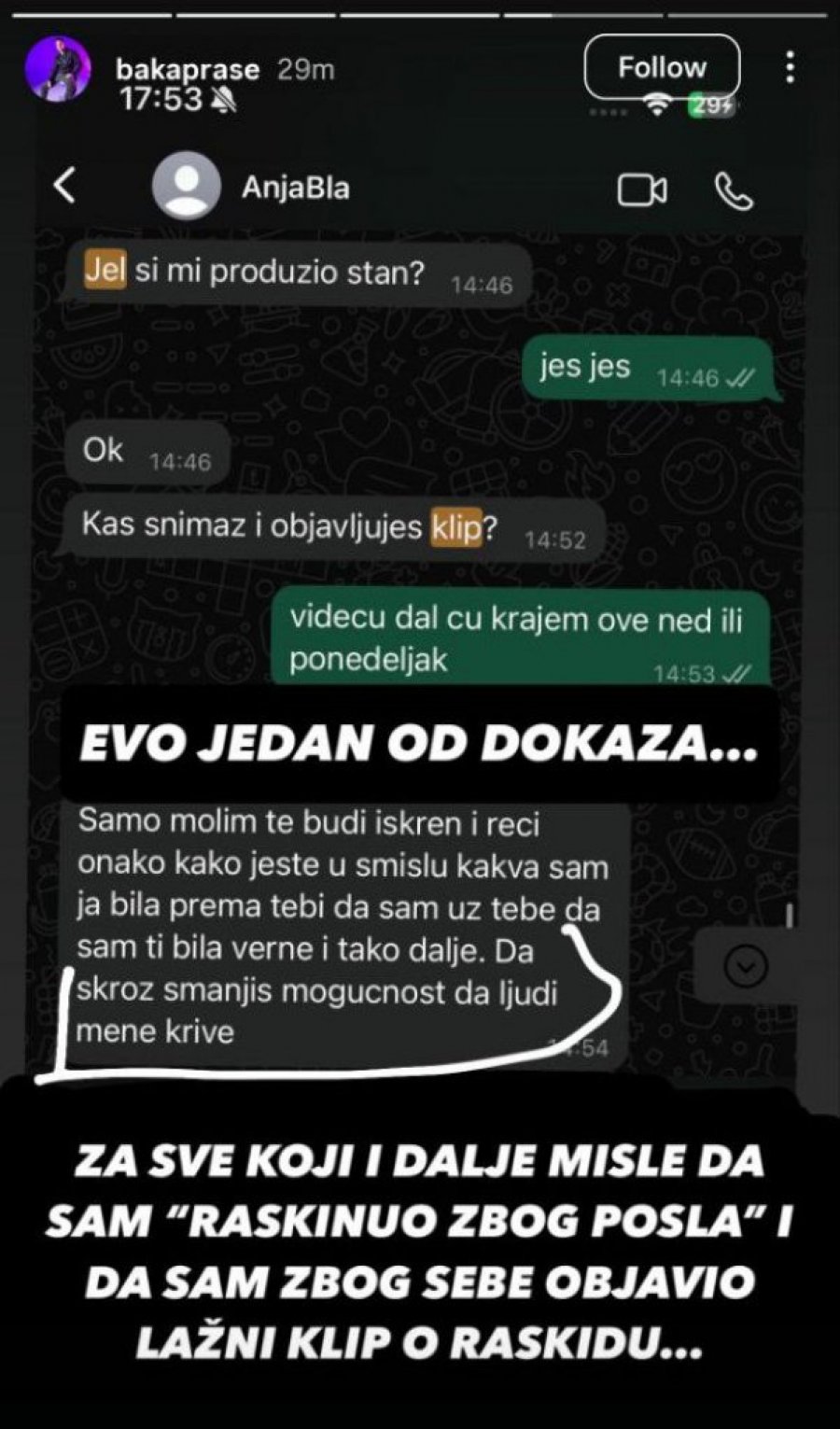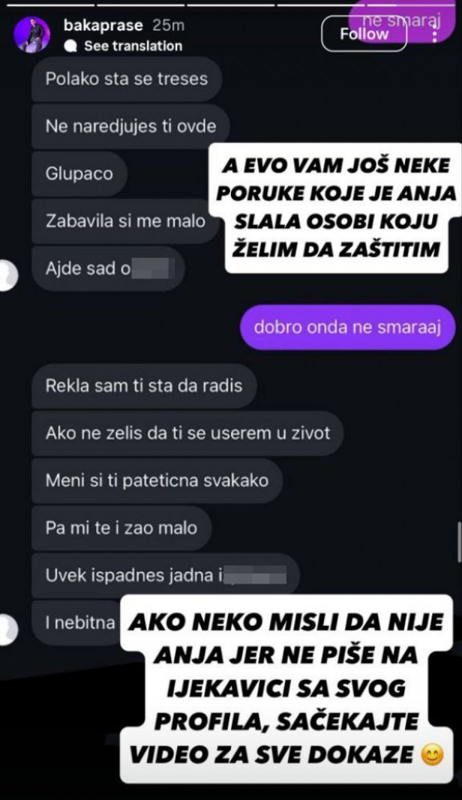 Juče je Baka Prase odlučio da raskrinka Anju Bla i krenuo da objavljuje dokazni materijal na svom instagram profilu. Večeras je nastavio i ponovo obelodanio poruke.