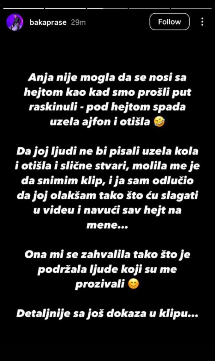 - Anja nije mogla da se nosi sa hejtom kao kada smo prošli put raskinuli - pod hejtom spada uzela ajfon i otišla. Da joj ljudi ne bi pisali uzela kola i otišla i slične stvari, molila me je da snimim klip i ja sam odlučio da joj olakšam tako što ću slagati u videu i navući sav hejt na mene. Ona mi se zahvalila tako što je podržala ljude koji su me prozivali - poručio je Baka Prase.