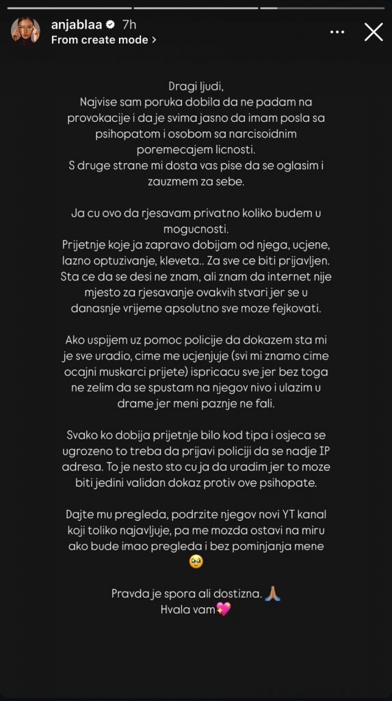 - Ako uspem uz pomoć policije da dokažem šta mi je sve uradio, čime me ucenjuje (svi mi znamo čime očajni muškarci prete) ispričaću sve, jer bez toga ne želim da se spuštam na njegov nivo i ulazim u drame, jer meni pažnje ne fali. Svako ko dobija pretnje bilo kog tipa i oseća se ugroženo, to treba da prijavi špoliciji, da se nađe IP adresa. To je nešto što ću ja da uradim, jer to može biti jedini validan dokaz protiv ove psihopate.