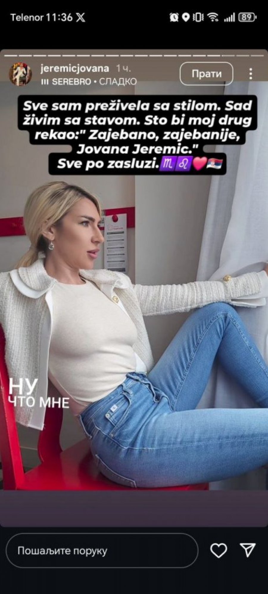 - Sve sam preživela sa stilom, sada živim sa stavom. Sto bi moj drug rekao "Zajebano, zajebanije, Jovana Jeremić". Sve po zasluzi.