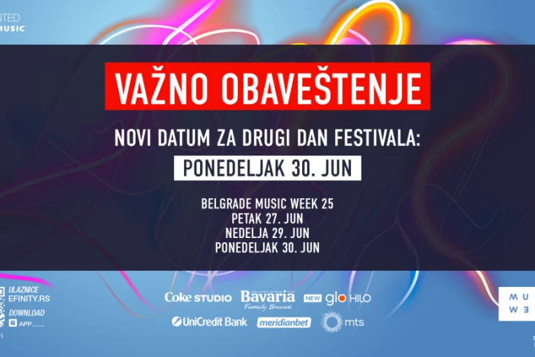 Tako će se najveći festival novog muzičkog talasa, Belgrade Music Week 2025, prema novom rasporedu održati u petak 27. juna, nedelju 29. juna i u PONEDELJAK 30. juna na Ušću. Programi zakazani za petak, 27. jun, i nedelju, 29. jun, odvijaće se prema planu.