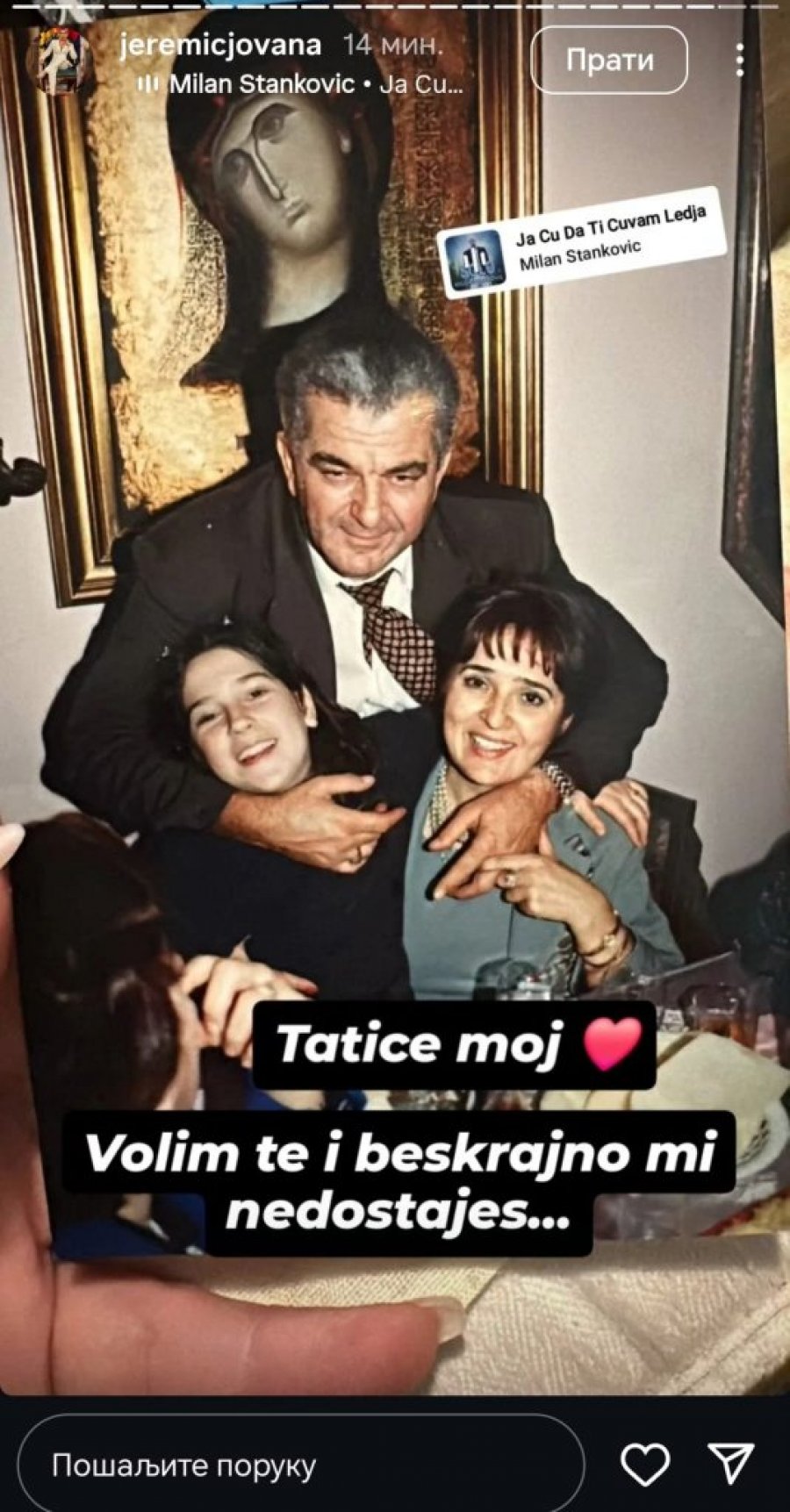 Jovana je tužnu vest podelila sa svojim pratiocima na Instagramu na posebno emotivan način – objavivši staru porodičnu fotografiju iz detinjstva. Na slici se vidi mala Jovana, nasmejana i zaigrana, dok je u zagrljaju svojih roditelja. Upravo ta slika, u kojoj je zabeležena iskrena porodična ljubav i sigurnost, dodatno je ganula sve one koji je prate i podržavaju.