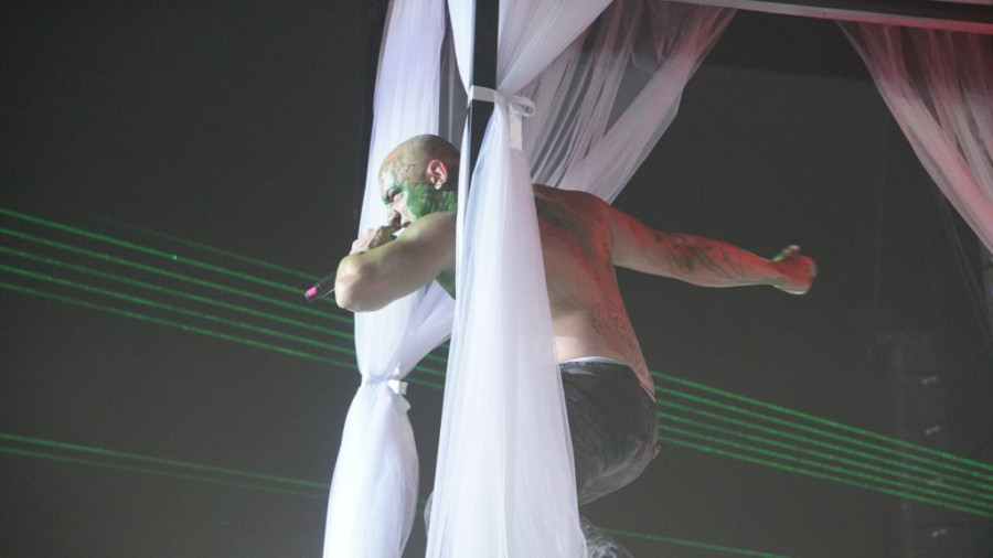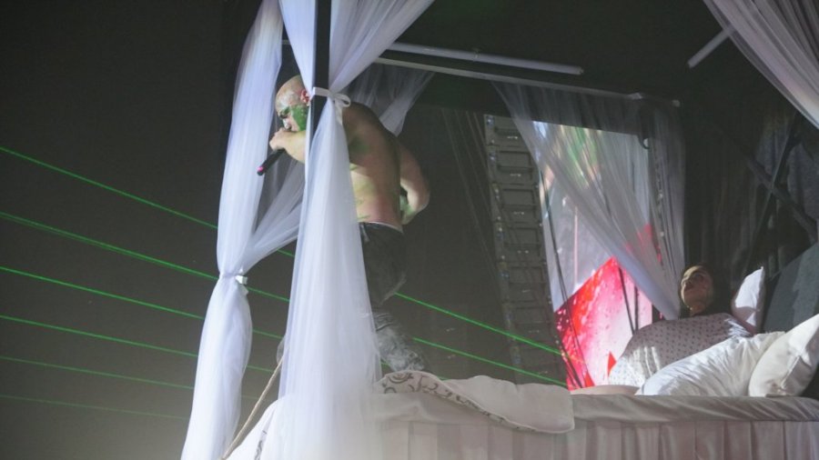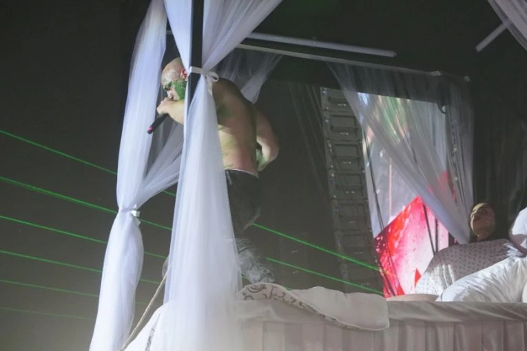 Publika, mahom sastavljena od njegovih vernih fanova, s nestrpljenjem je iščekivala njegov izlazak, a ono što su dobili bilo je sve, samo ne uobičajeni koncert. Na sceni je dočekao performans koji je mnoge ostavio u šoku - u centru bine nalazio se ogroman krevet, a na njemu devojka koja je glumila porođaj, dramatično se previjajući i vrišteći od "bolova", a zatim je "rodila" njega.