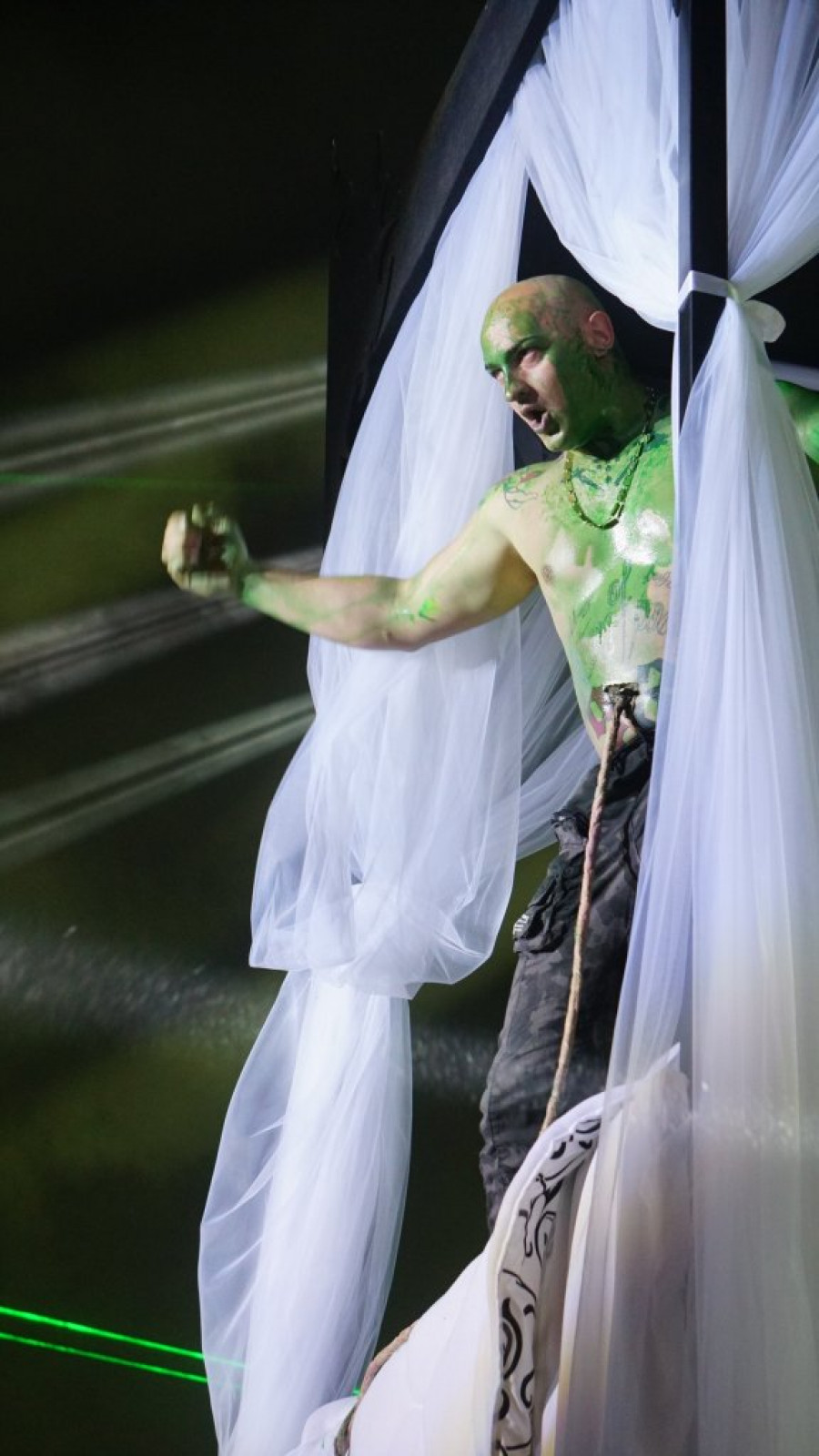 Desingerica, obučen samo u pantalone i prekriven zelenom bojom po telu, izvodio je svoje hitove, skačući po krevetu.