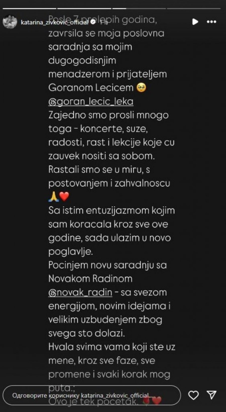 - Posle sedam prelepih godina završila se moja poslovna saradnja sa mojim dugogodišnjim menadžerom i prijateljem Goranom Lečićem. Zajedno smo prošli mnogo toga - koncerte, suze, radost, rast i lekcije koje ću zauvek nositi sa sobom. Rastali smo se u miru, sa poštovanjem i zahvalnošću - rekla je Katarina.