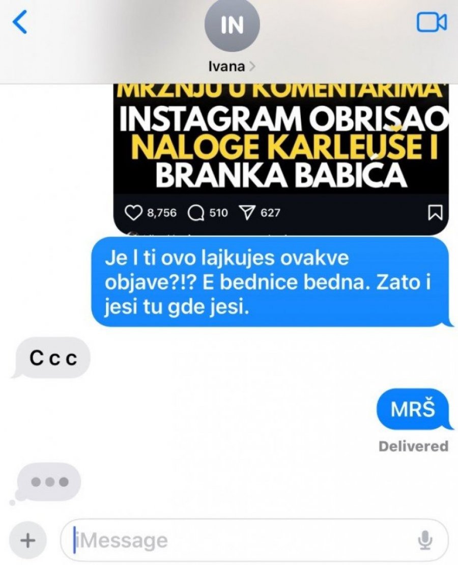 - Jel ti ovo lajkuješ ovakve objave?! E bednice bedna, zato i jesi tu gde jesi - glasila je poruka Karleuše upućene Ivani.