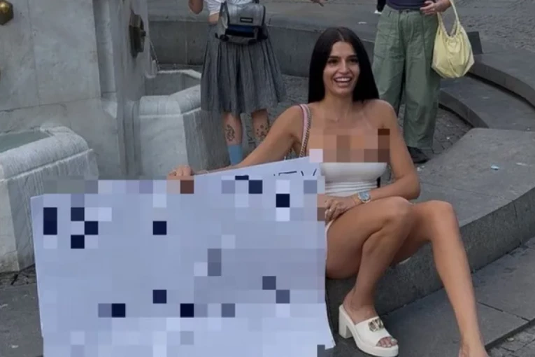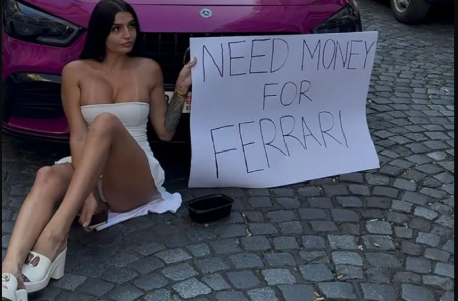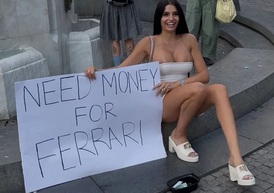 Sa velikim transparentom u rukama, na kom je pisalo "Potreban mi je novac za ferari", izazvala je brojne reakcije prolaznika. Ova provokativna šala nije prošla nezapaženo, a osim nje, pored nje se nalazila i činijica u koju su ljudi mogli ostavljati novac.