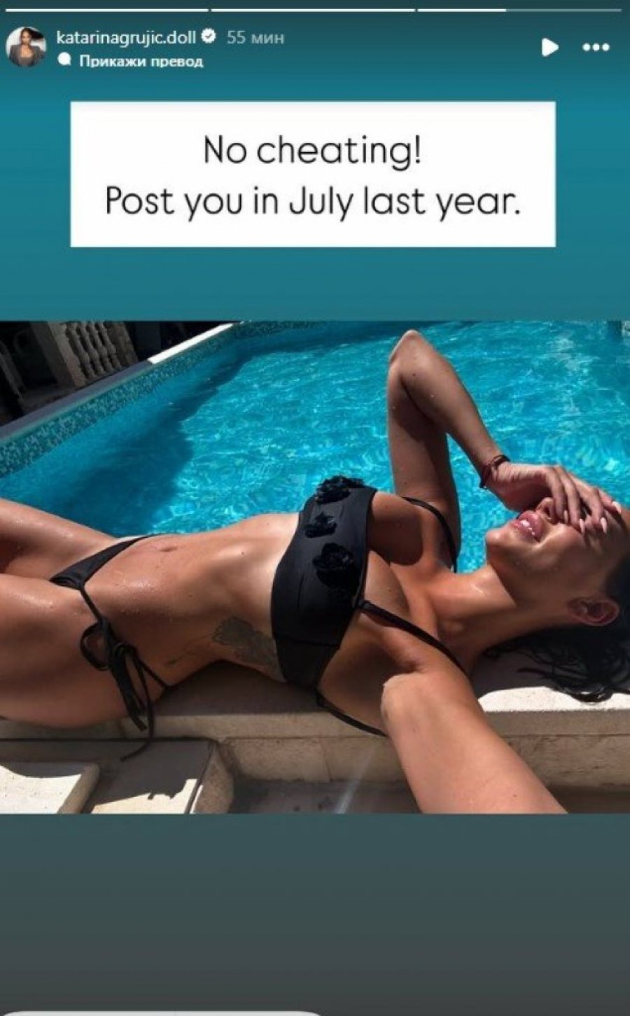 Fotografija s bazena, u kojoj zavodljivo pozira dok sunčevi zraci miluju njenu kožu, samo je još jedan dokaz da Katarina Grujić ne silazi sa trona jedne od najpoželjnijih dama domaće estrade.