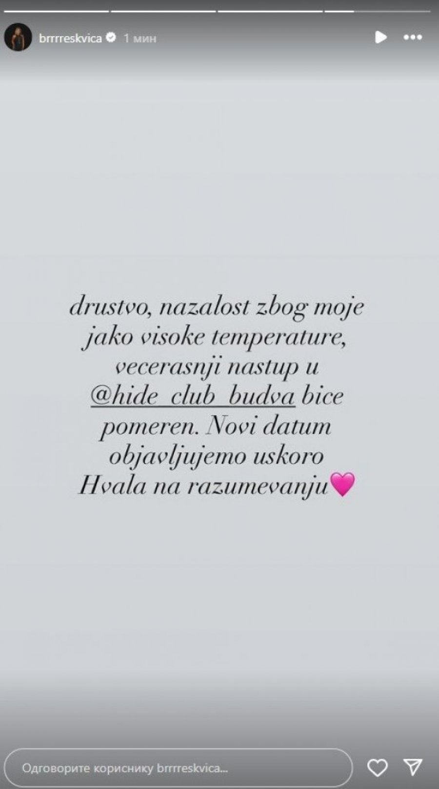 — Društvo, nažalost, zbog moje jako visoke temperature, večerašnji nastup biće pomeren. Novi datum objavljujem uskoro. Hvala na razumevanju - poručila je.
