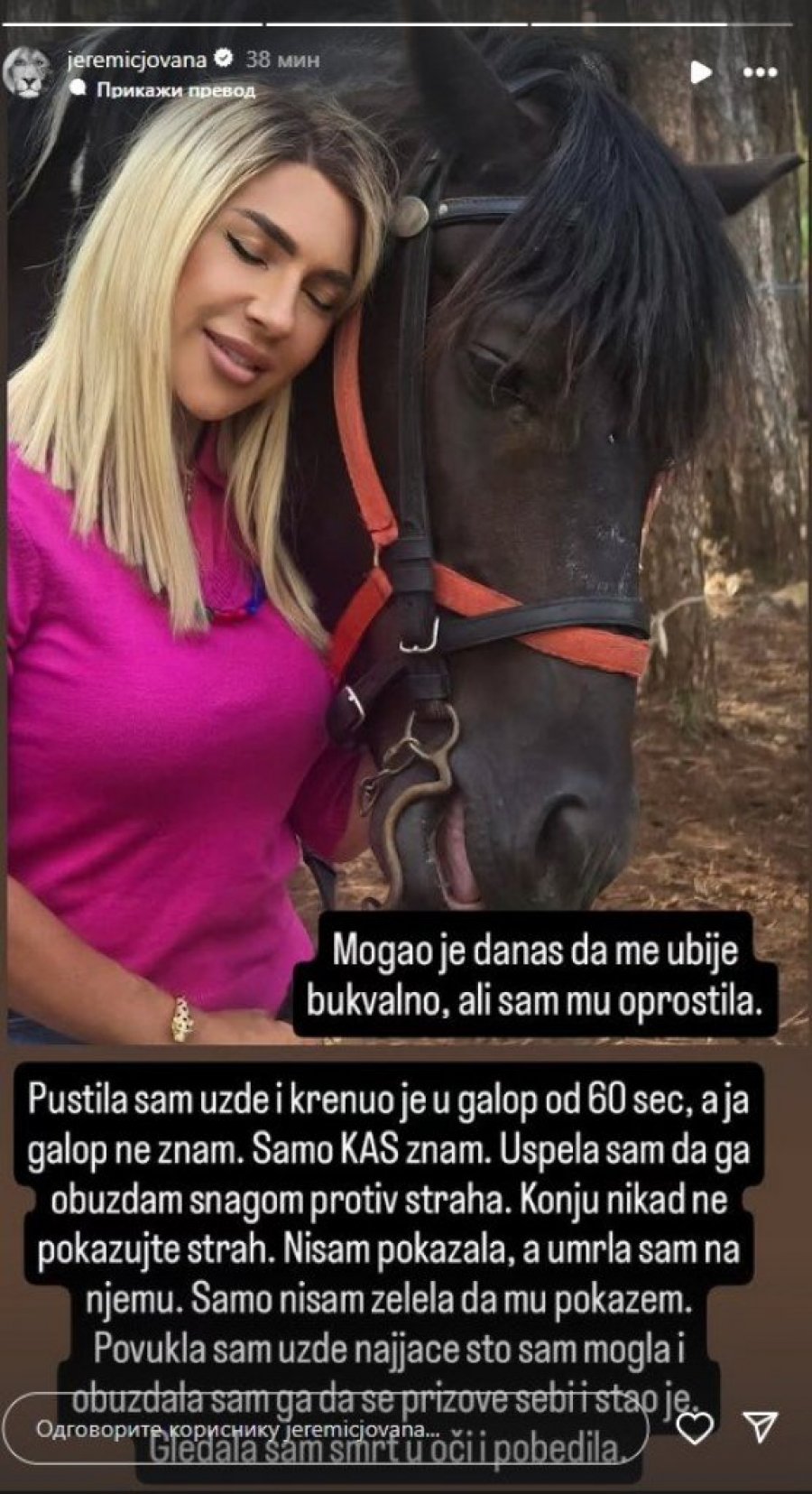 Naime, Jovana je objavila video i niz fotografija sa jahanja konja po imenu Vihor, uz emotivnu i ličnu ispovest u kojoj otkriva koliko je trenutak bio opasan, ali i transformišući za nju.