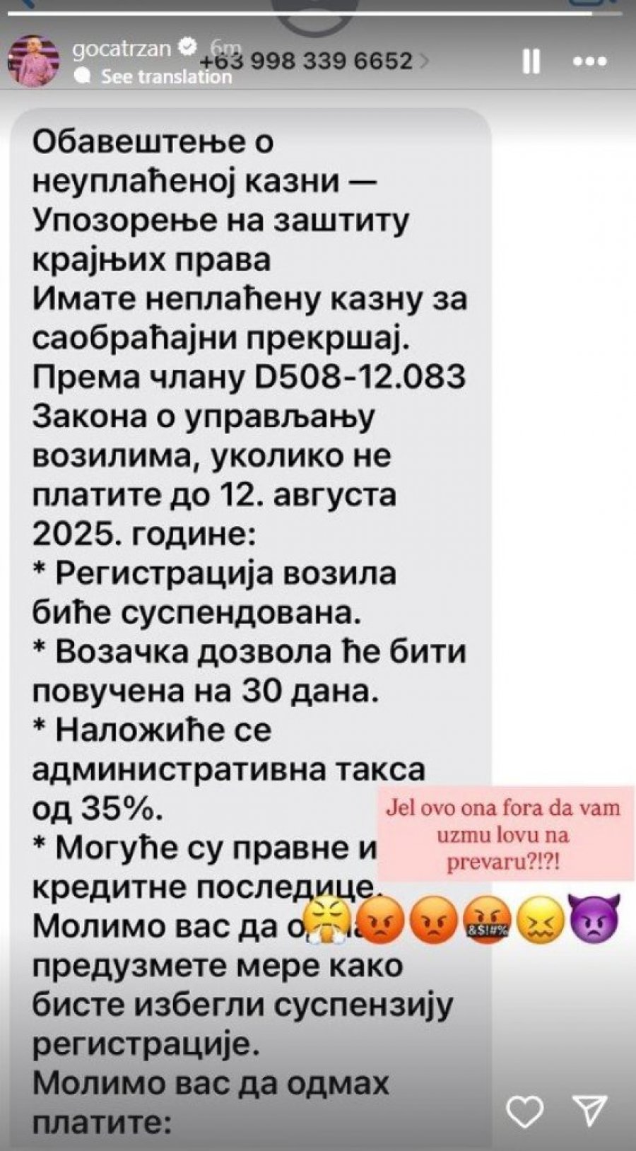 Goca je uz objavu postavila i svoje pitanje pratiocima: "Jel ovo ona fora da vam uzmu lovu na prevaru?!" dodavši niz ljutitih emotikona, jasno stavljajući do znanja da sumnja u verodostojnost poruke.