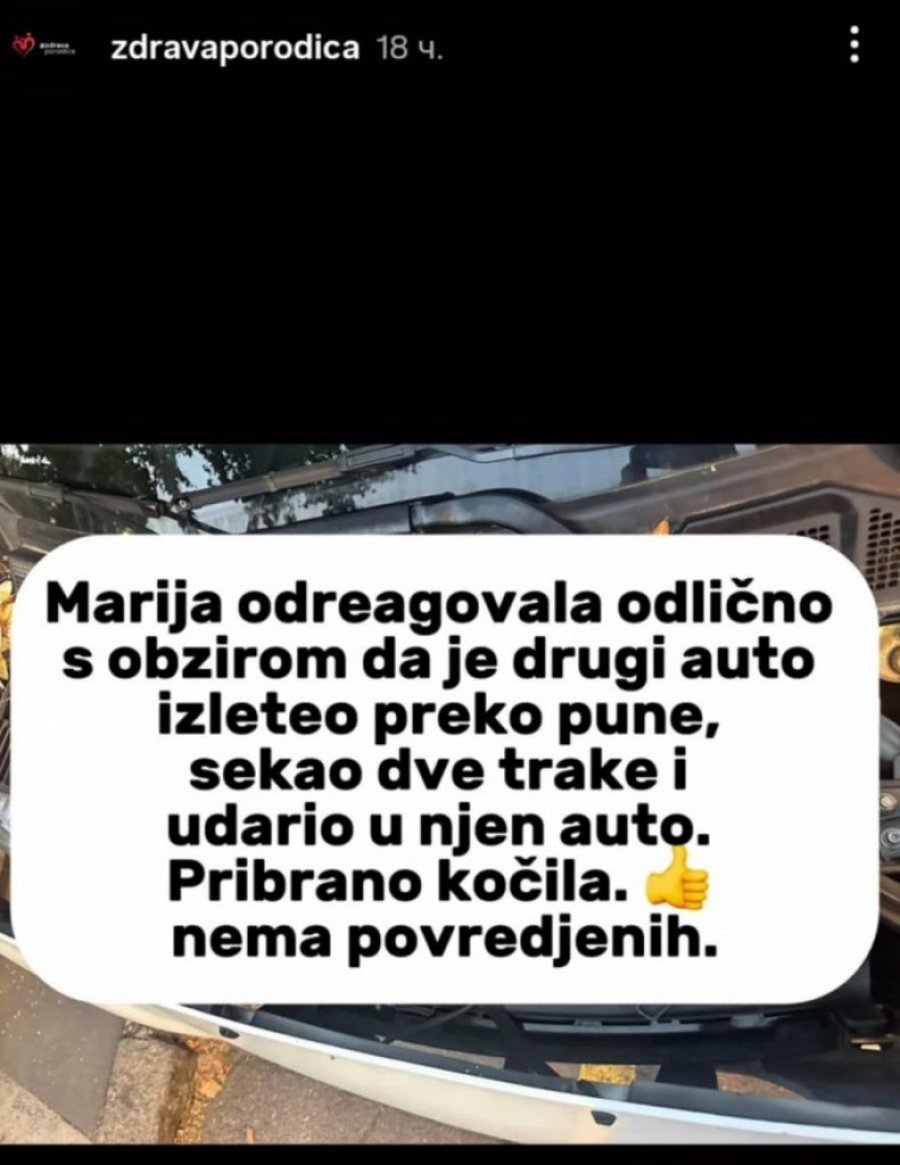 - Marija je odreagovala odlično, s obzirom da je drugi auto izleteo preko pune linije, sekao dve trake i udario u njen automobil. Pribrano je zakočila, pa nema povređenih - napisao je Milan Popović, te istakao u kakvom je stanju njegova supruga.