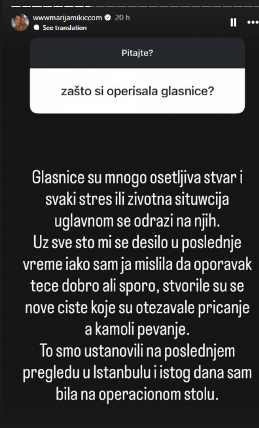 - Glasnice su mnogo osetljiva stvar i svaki stres ili životna situacija uglavnom se odrazi na njih. Uz sve što mi se desilo u poslednje vreme iako sam ja mislila da oporavak teče dobro, ali sporo, stvorile su se nove ciste koje su otežavale pričanje, a kamoli pevanje. To smo ustanovili na poslednjem pregledu u Istanbulu i istog dana sam bila na operacionom stolu - završila je Mikićeva.