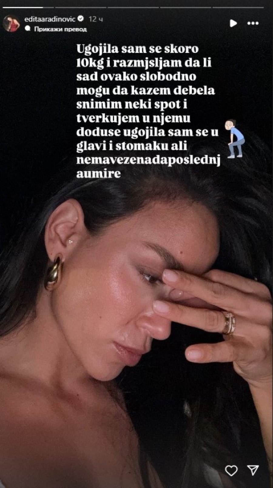 – Ugojila sam se skoro 10 kilograma i razmišljam da li sada mogu da kažem da sam debela i snimim neki spot dok tverkujem u njemu. Doduše, ugojila sam se u glavi i stomaku, ali nema veze, nada poslednja umire – napisala je Edita uz osmeh.