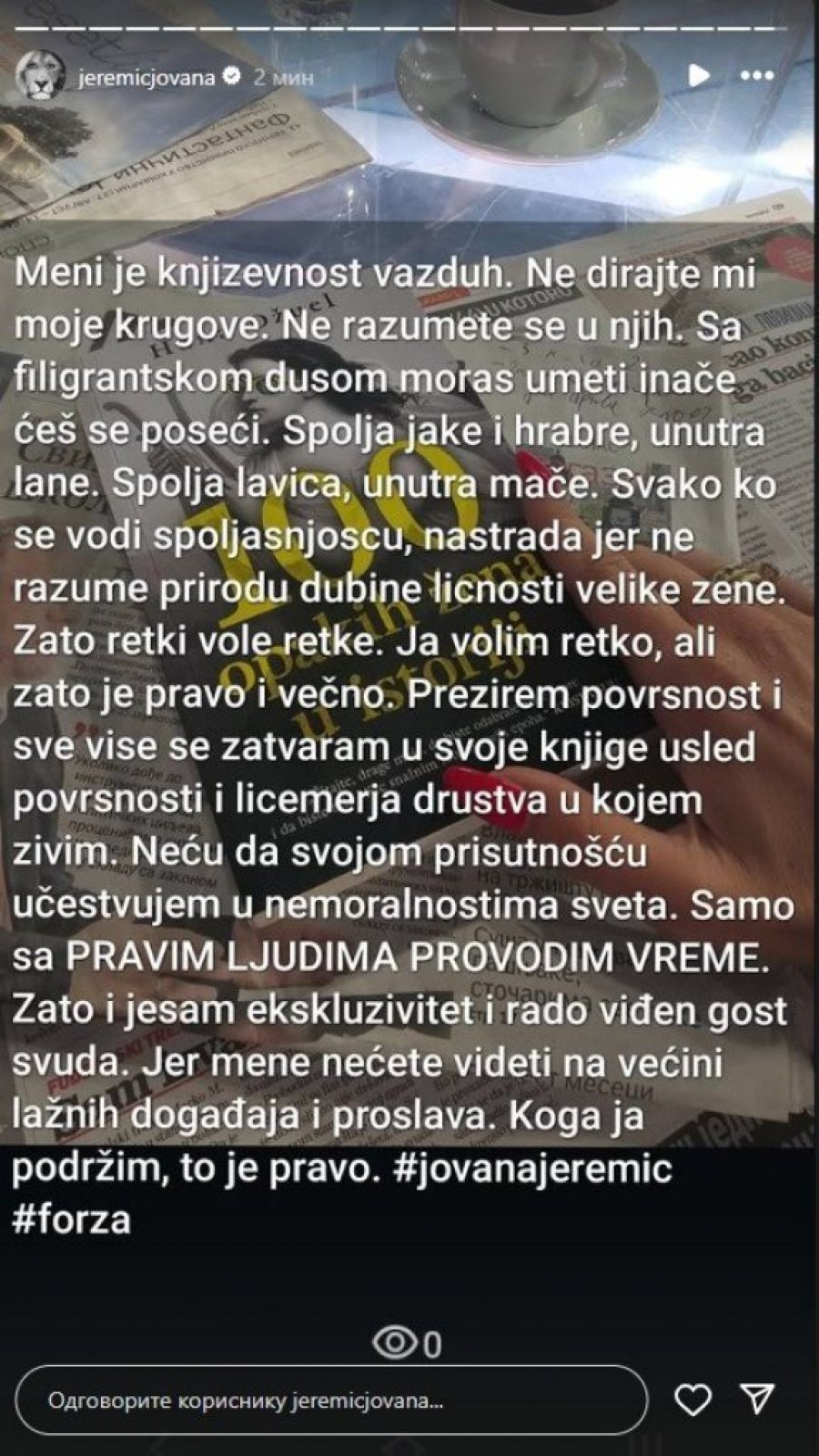 - Meni je književnost vazduh. Ne dirajte mi moje krugove. Ne razumete se u njih. Sa filigrantskom dušom moraš umeti inače ćeš se poseći. Spolja jake i hrabre, unutra lane. Spolja lavica, unutra mače. Svako ko se vodi spoljasnjoscu nastrada jer ne razume prirodu dubine ličnosti velike žene. Zato retki vole retke. Ja volim retko, ali zato pravo i večno. Prezirem površnost i sve više se zatvaram u svoje knjige usled površnosti i licemerja društva u kojem živim. Neću da svojom prisutnošću učestvujem u nemoralnostima sveta. Samo sa pravim ljudima provodim vreme. Zato i jesam eksluzivitet i rado viđen gost svuda. Jer mene nećete videti na većini lažnih događaja i proslava. Koga ja podržim to je pravo - poručila je Jovana Jeremić.