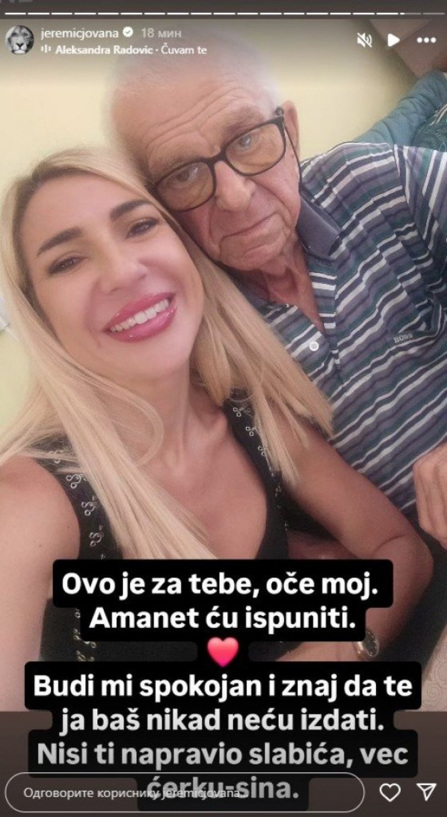 Gubitak oca nije lak ni za jednu osobu, a Jovana Jeremić ga je doživela sa velikom tugom, ali i sa dubokim poštovanjem prema njegovom sećanju. Njena poruka, iskrena i emotivna, potvrđuje koliko su porodične veze važne i koliko nas uspomene i amaneti naših najbližih mogu oblikovati i motivisati kroz život.
