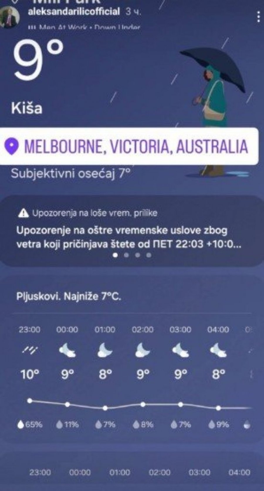 Aleksandar Ilić, poznati pevač, nedavno je podelio alarmantno upozorenje koje je primio na svoj mobilni telefon, a koje se odnosi na snažnu oluju koja trenutno pogađa Melburn, grad u kojem se nalazi.