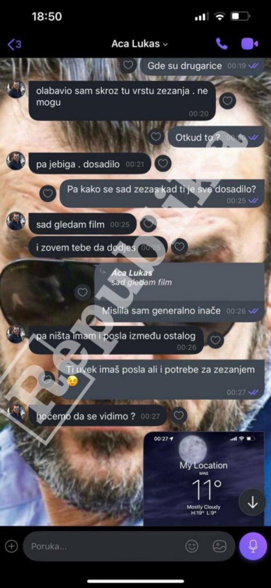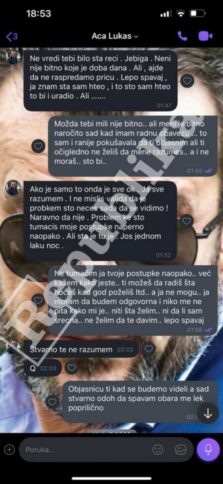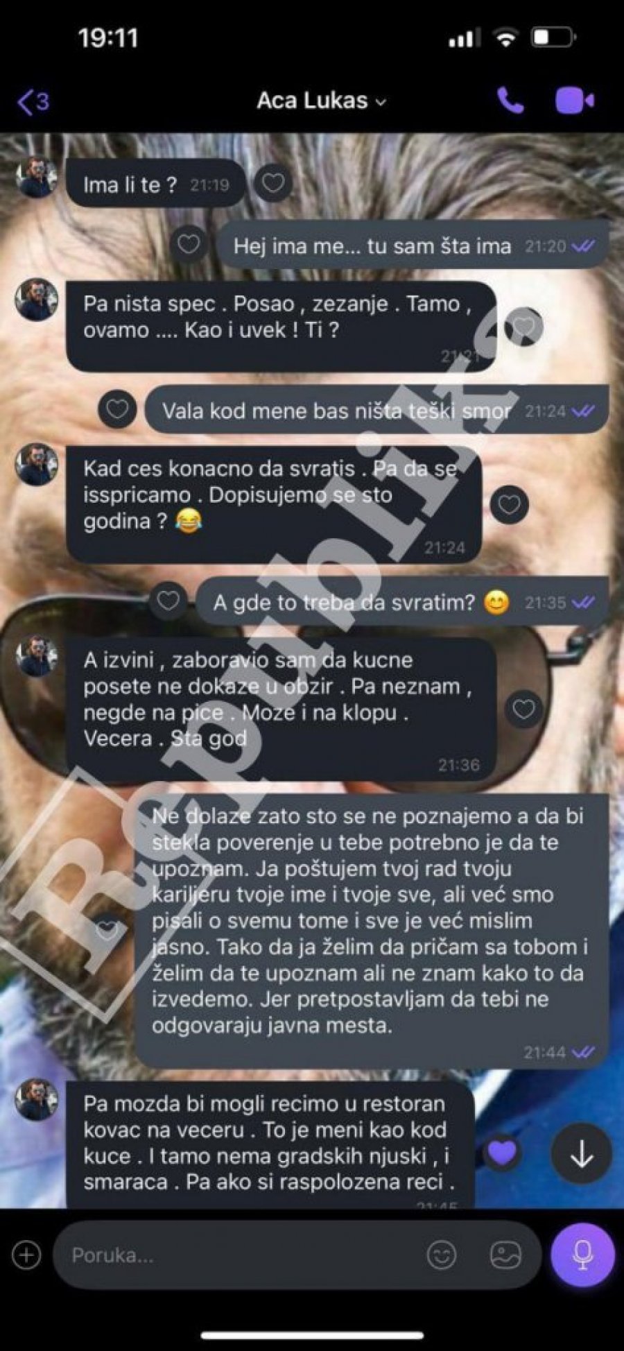 - Kakva slika? Odakle vama ta fotografija?! Tu sliku mogu da imaju samo tri osobe iz mog života... Samo tri osobe, ali očigledno ne dobre osobe. To je vama neko dostavio? Pa dobro... Šta je, tu je, žao mi je što je tako jer sam se upravo razočarala u jednu od te tri osobe. To su Acine i moje zajedničke drugarice koje su s nama svojevremeno izlazile i pile, verovatno je neka od njih to poslala vama. Sad mi je malo i neprijatno, ali, dobro, neću da lažem! To sam ja, to je on, nije foto-montaža. Ne mogu da vrdam, Aca je jedno prepametno i divno stvorenje, preinteligentan je čovek, uvek mi je zanimljivo s njim. Ali nikad ga nisam gledala zbog karijere i toga šta je uradio i stekao. Znam kakav ga glas bije, kakve ga sve priče sa ženama prate, zato sam i razmišljala dve godine da se uopšte upoznamo. Ali, s vremenom, shvatila sam koliko je nežan i emotivan, to što pričaju i pišu nema veze s životom. Za njega se žene kače da bi postale slavne, da kažu da su bile s Acom Lukasom, a on nije ni prošao pored njih. Evo, koliko se Aca i ja poznajemo... Ja nikada u životu nisam progovorila o njemu, ovo sada sve prvi put pričam i verovatno više nikada. Meni slava na račun njegovog imena ne treba! Ako sam kvalitet, steći ću je sama. Žao mi je što sve o nama dospelo u javnost, ali ja nisam osoba koja će da krije i laže i da se pravim luda kao što mnogi to na estradi rade - poručila je, pa nastavila: