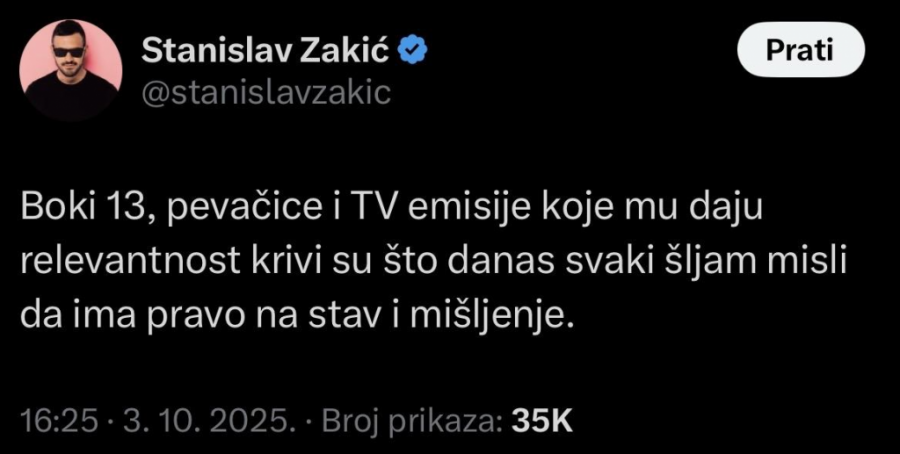 - Boki 13, pevačice i TV emisije koje mu daju relevantnost krivi su što danas svaki šljam misli da ima pravo na stav i mišljenje! - dodao je.