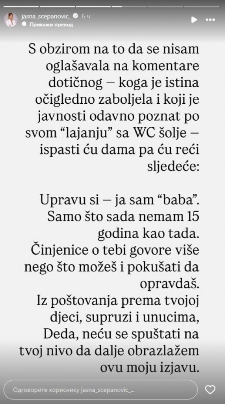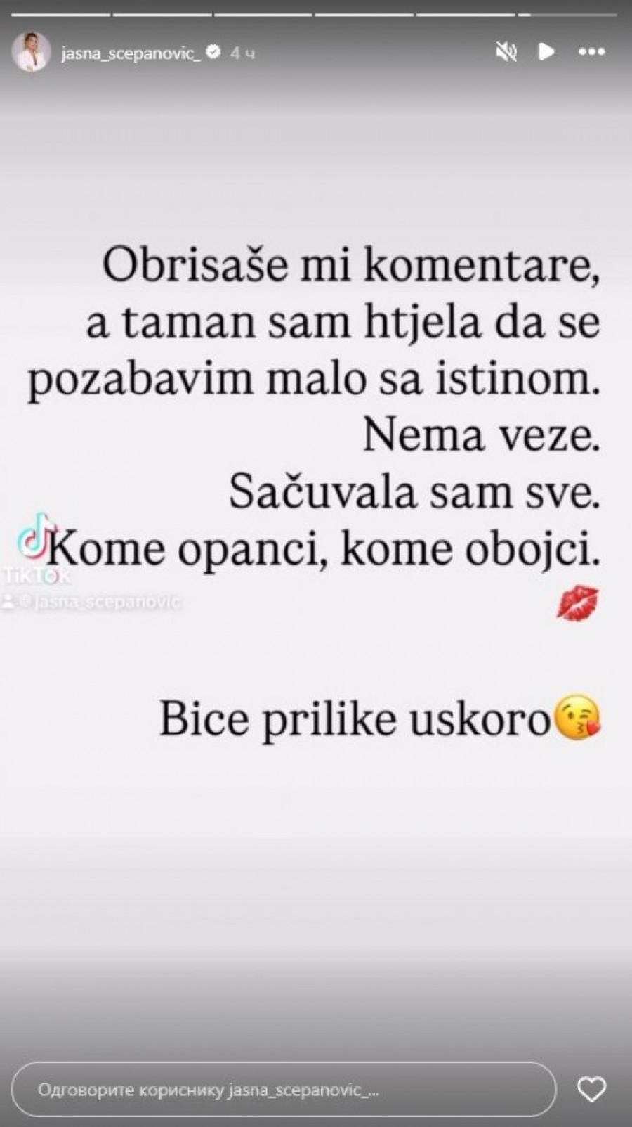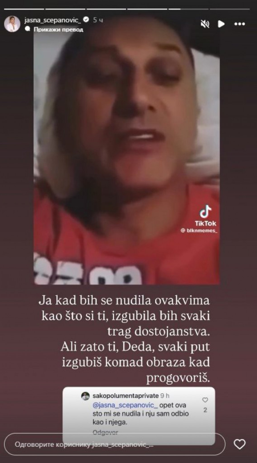 Njegovu izjavu ubrzo je prokomentarisala i pevačica Jasna Šćepanović, koja je javno stala na Emirovu stranu, ali na duhovit način.