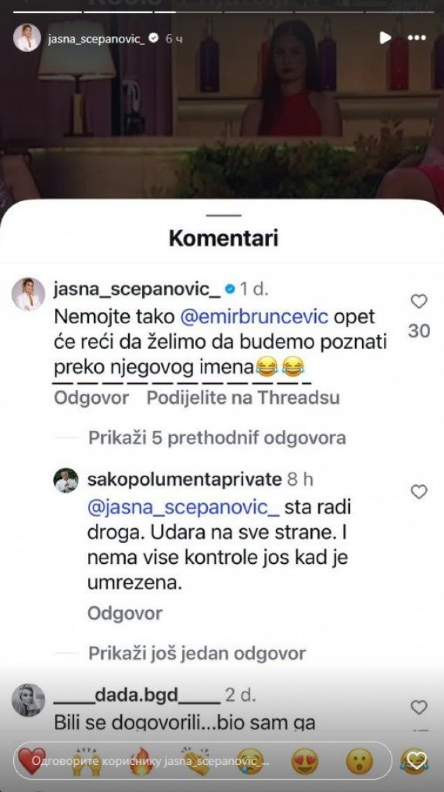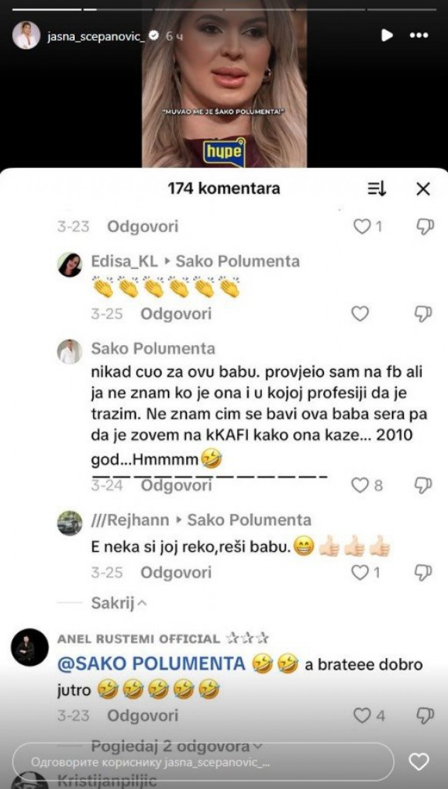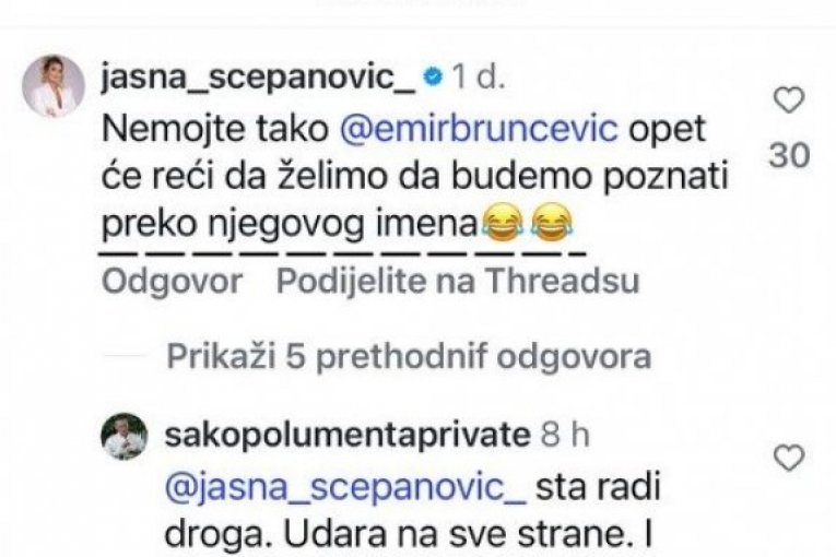 – Nemoj tako, Emire, opet će Šako Polumenta reći da želimo da budemo poznati preko njegovog imena – napisala je Jasna uz emotikon smeha, što je dodatno podgrejalo raspravu među njihovim pratiocima.