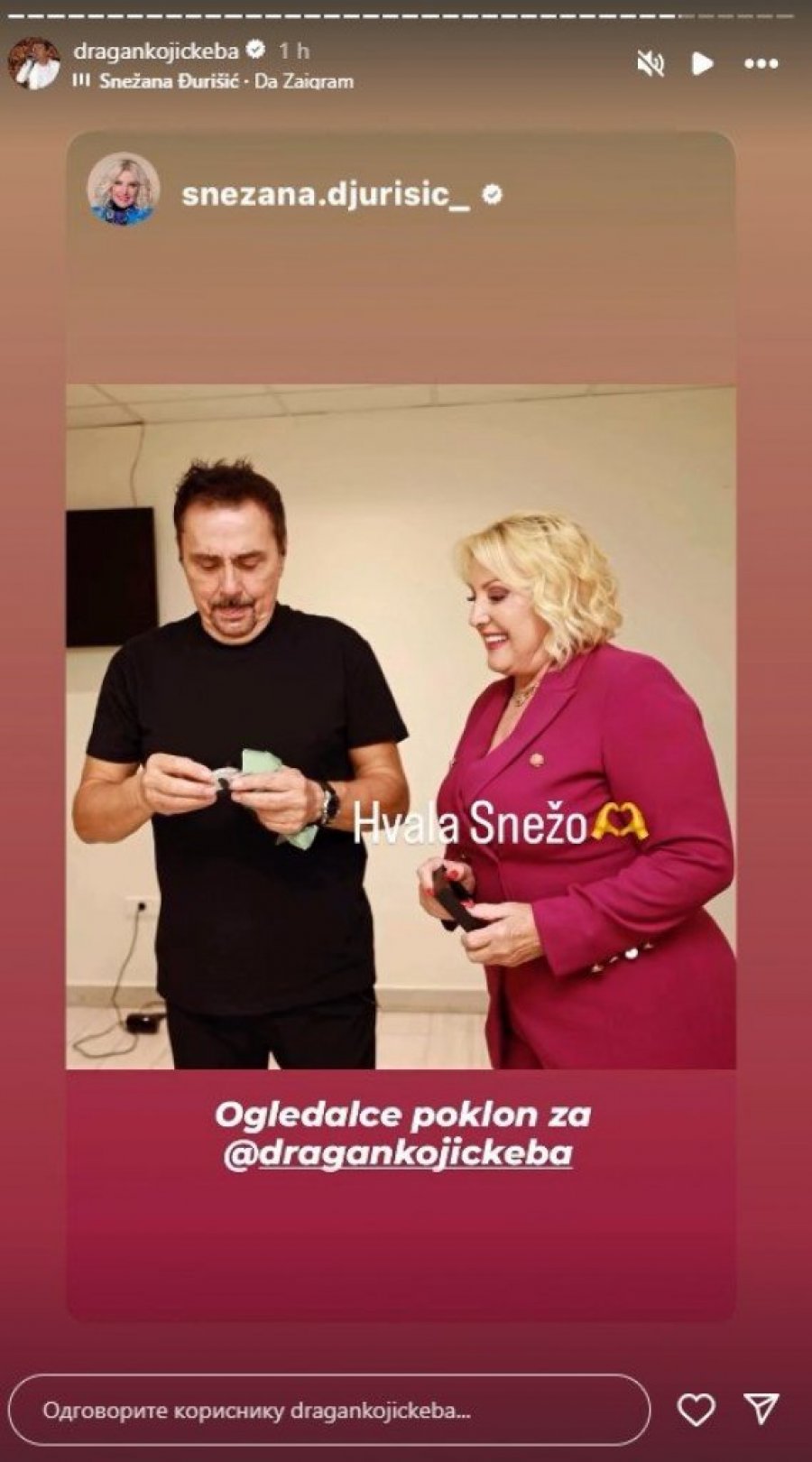 – Poklon za Kebu, ogledalce – napisala je Snežana na svom Instagram storiju, uz fotografiju trenutka kada mu ga je predala, nasmejana i raspoložena.