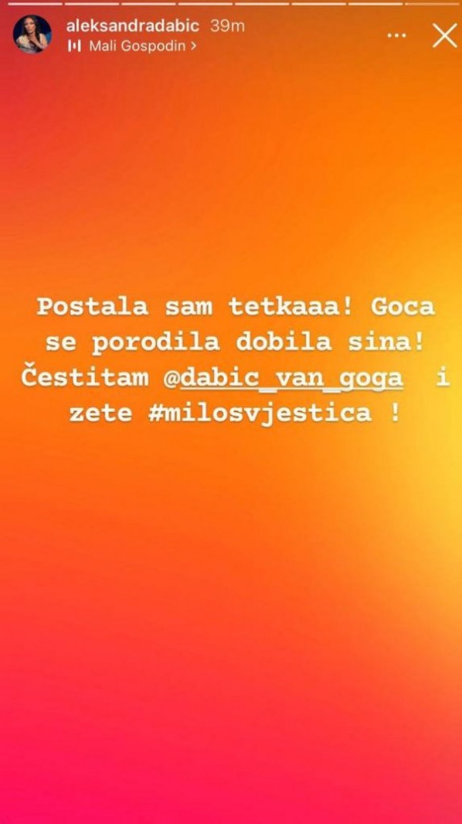 - Postala sam tetka! Goca se porodila i dobila sina! Čestitam Dabić Gogi i zetu Milošu! - napisala je pevačica u svojoj objavi, vidno srećna.