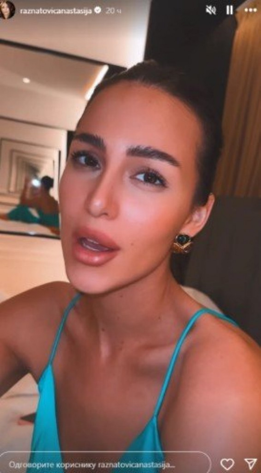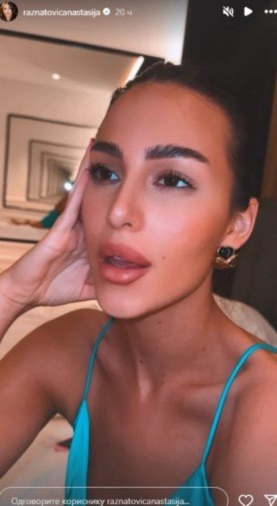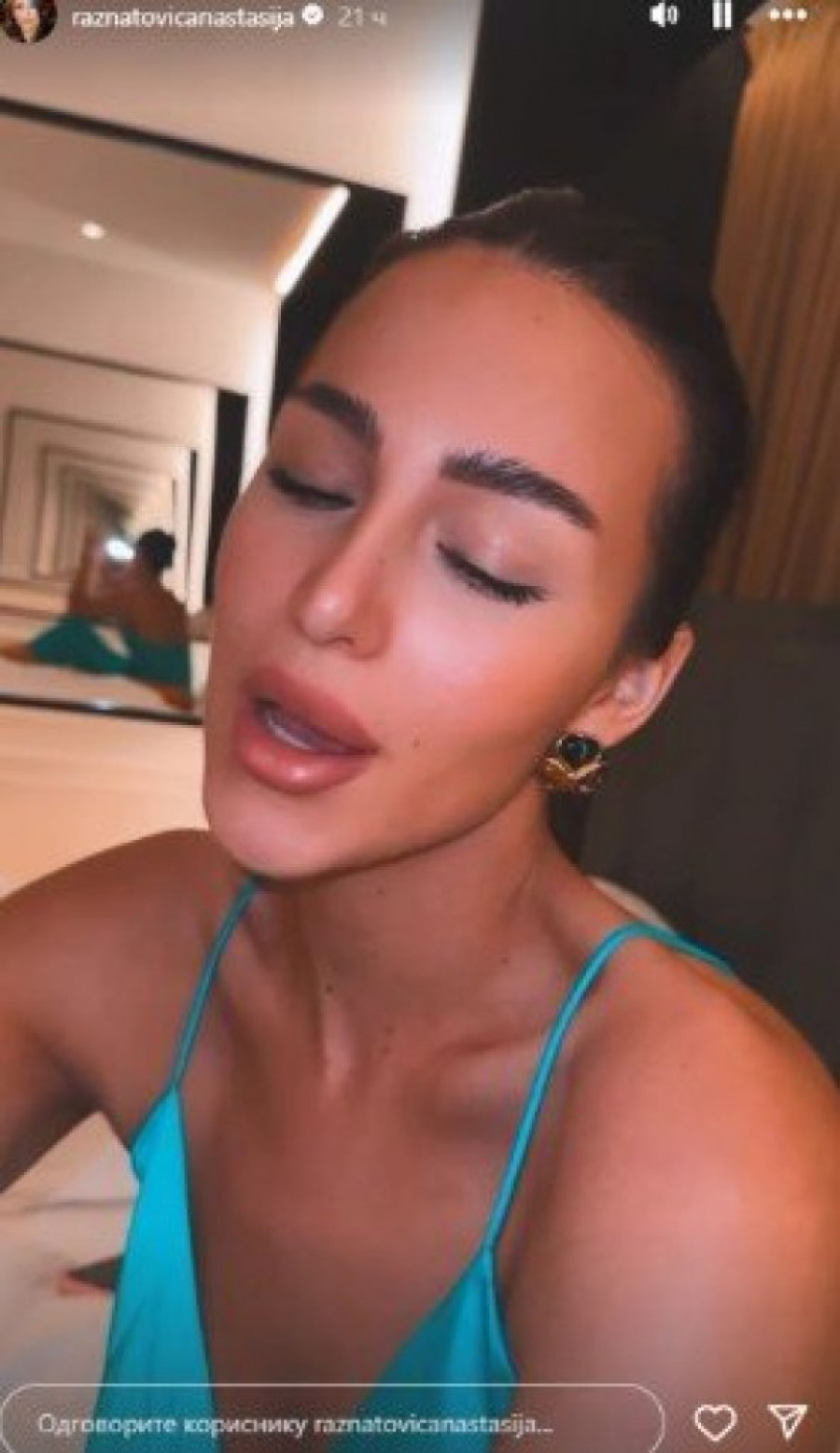 Anastasija Ražnatović ponovo je zapalila društvene mreže najnovijom objavom. Na snimku koji je podelila na Instagram profilu pevačica se opušteno snima dok sedi na krevetu, noseći izazovnu plavu satensku spavaćicu, bez brushaltera. Njeno izdanje oduševilo je mnoge, a pozitivni komentari nizali su se samo tako.
