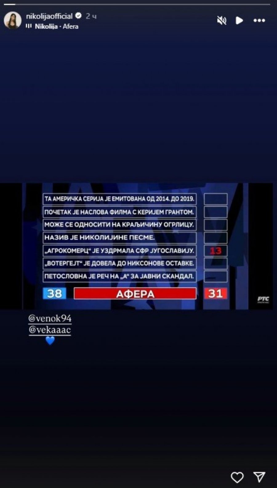 Pevačica Nikolija Jovanović nedavno je na društvenim mrežama podelila zanimljiv detalj koji ju je oduševio – njeno ime i pesma pojavili su se u popularnom kvizu "Slagalica“. Naime, u rubrici asocijacije, kao jedan od tragova za reč "afera“, navedeno je: "Pesma Nikolije Jovanović“, što je pevačicu posebno obradovalo.