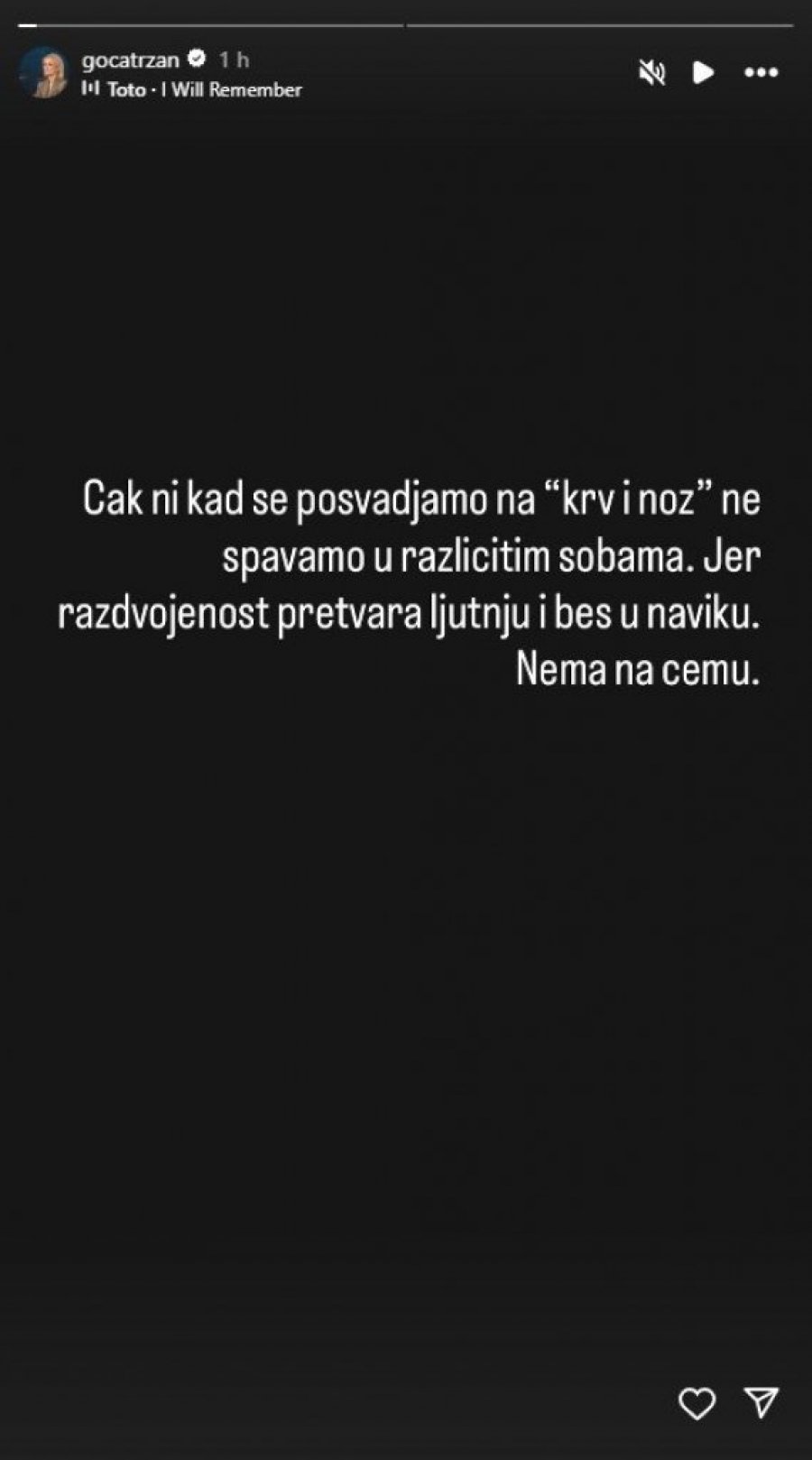 - Čak ni kad se posvađamo na "krv i nož" ne spavamo spavamo u različitim sobama. Jer razdvojenost pretvara ljutnju i bes u naviku. Nema na čemu - poručila je Goca Tržan.
