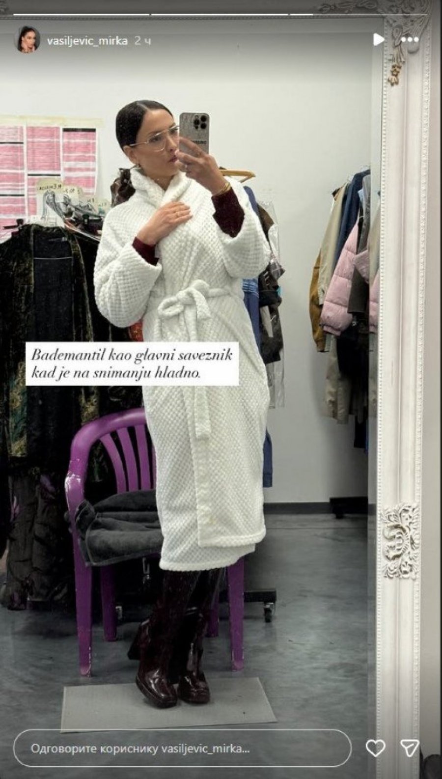 Glumica Mirka Vasiljević sve je aktivnija na društvenim mrežama, gde gotovo svakodnevno deli trenutke iz svog života i rada. Ovog puta podelila je fotografiju iz garderobera, otkrivajući na koji način se greje tokom hladnih dana na snimanjima.