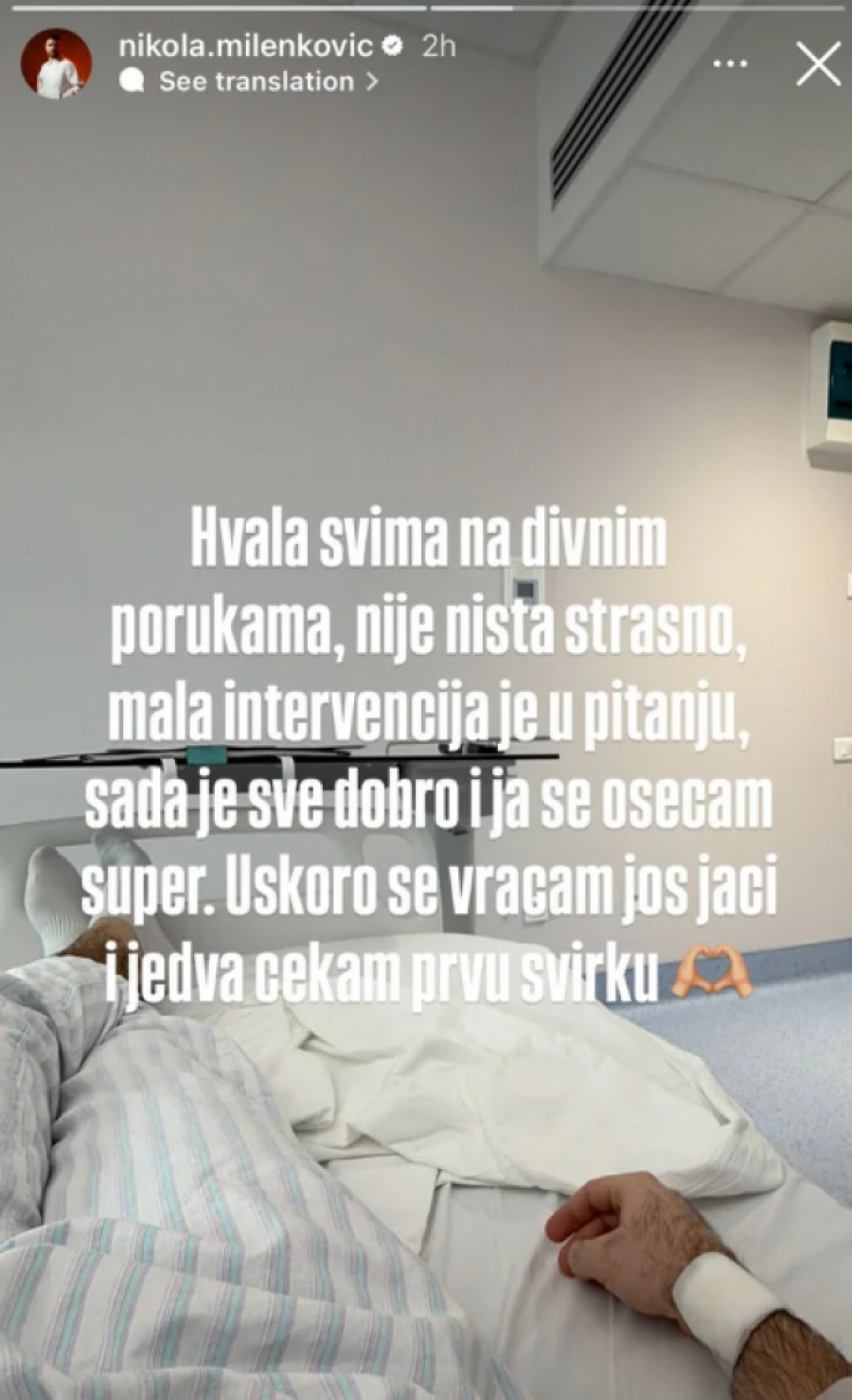- Hvala svima na divnim porukama! Nije nista strašno, mala intervencija je u pitanju, sada je sve dobro i ja se osećam super. Uskoro se vraćam jos jači i jedva čekam prvu svirku - napisao je Nikola Milenković.