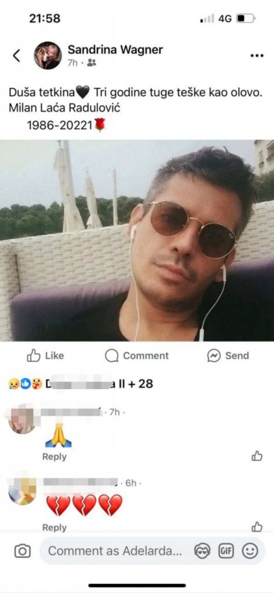 - Duša tetkina. Tri godine tuge teške kao olovo. 1986-2021 - napisala je tetka uz crna srca, jasno i emotivno izražavajući koliko je njegov odlazak ostavio prazninu u njihovim životima.