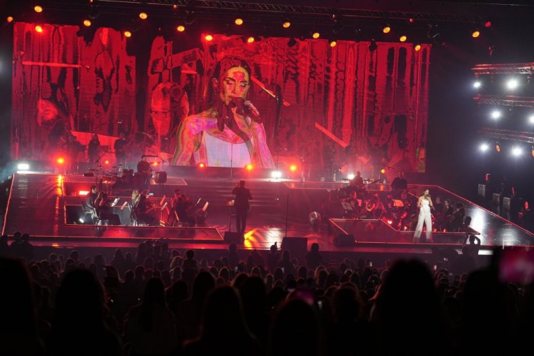Pevačica Emina Jahović održava svoj treći koncert u Beogradu, a događaj se odvija u prestižnom Sava Centru. Ova talentovana umetnica, koja je poznata po svojoj scenskoj energiji i harizmi, večeras se pojavila u elegantnom izdanju – obukla je belo odelo i ogrtač od perja, što je doprinelo njenom glamuroznom izgledu. Sa zalizanom kosom i efektnim minđušama, Emina je odmah privukla pažnju publike i stvorila uzbudljivu atmosferu.