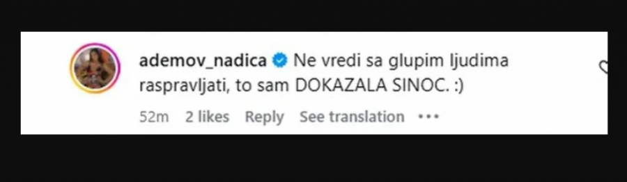 - Ne vredi, sa glupim ljudima raspravljati, to sam dokazala sinoć - odgovorila joj je Nadica Ademov.