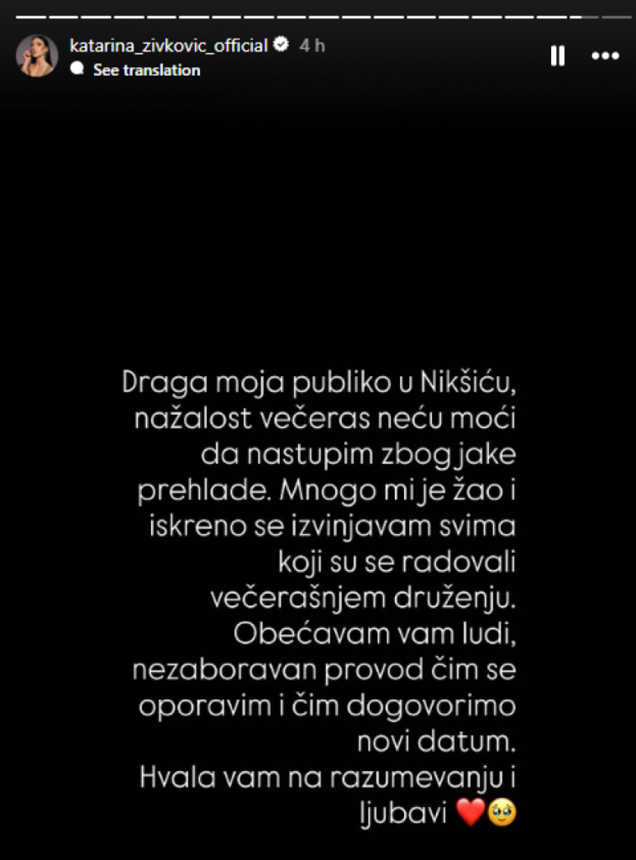 - Draga moja publiko u Nikšiću, nažalost večeras neću moći da nastupim zbog jake prehlade. Mnogo mi je žao i iskreno se izvinjavam svima koji su se radovali večerašnjem druženju. Obećavam vam ludi, nezaboravan provod, čim se oporavim i čim dogovorimo novi datum. Hvala sam na razumevanju i ljubavi - napisala je Katarina na Instagramu, a sledeći stori bio je kako koristi inhalator