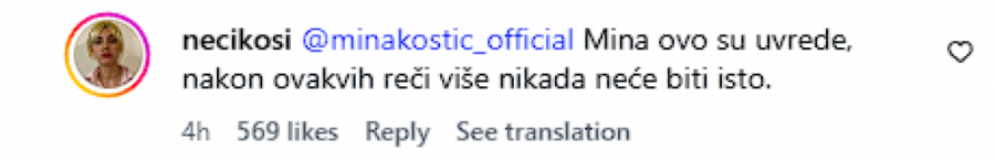 "Koliko ste jadni, bedni, ljudsko dno", napisala je Mina, na šta joj je Necikosi odgovorila u šaljivom tonu: "Mina ovo su uvrede, nakon ovakvih reči više nikada neće biti isto."