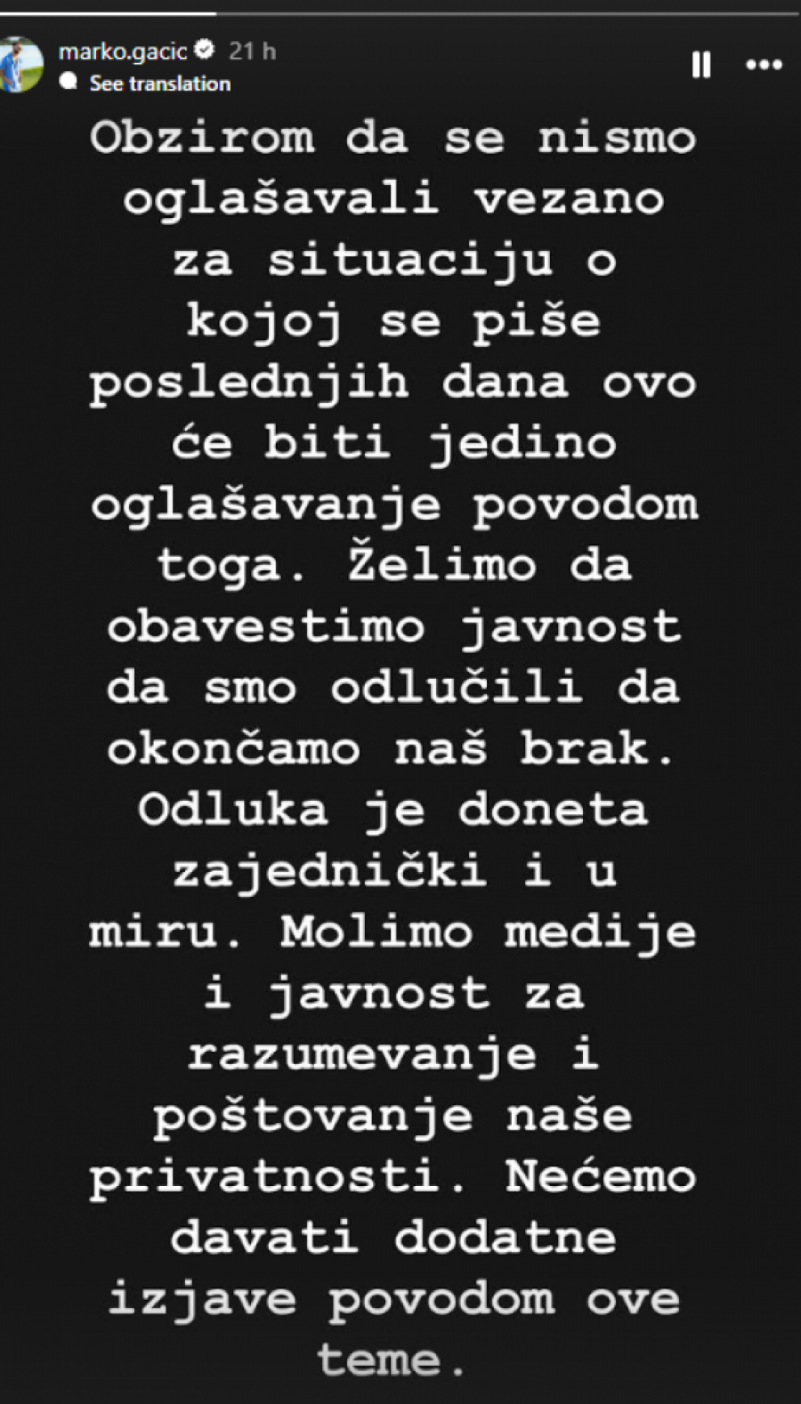 - Obzirom da se nismo oglašavali vezano za situaciju o kojoj se piše poslednjih dana ovo će biti jedino oglašavanje povodom toga. Želimo da obavestimo javnost da smo odlučili da okončamo naš brak. Odluka je doneta zajednički i u miru. Molimo medije i javnost za razumevanje i poštovanje naše privatnosti. Nećemo davati dodatne izjave povodom ove teme - napisali su Goga i Marko Gačić i objavili na Instagram profilima.