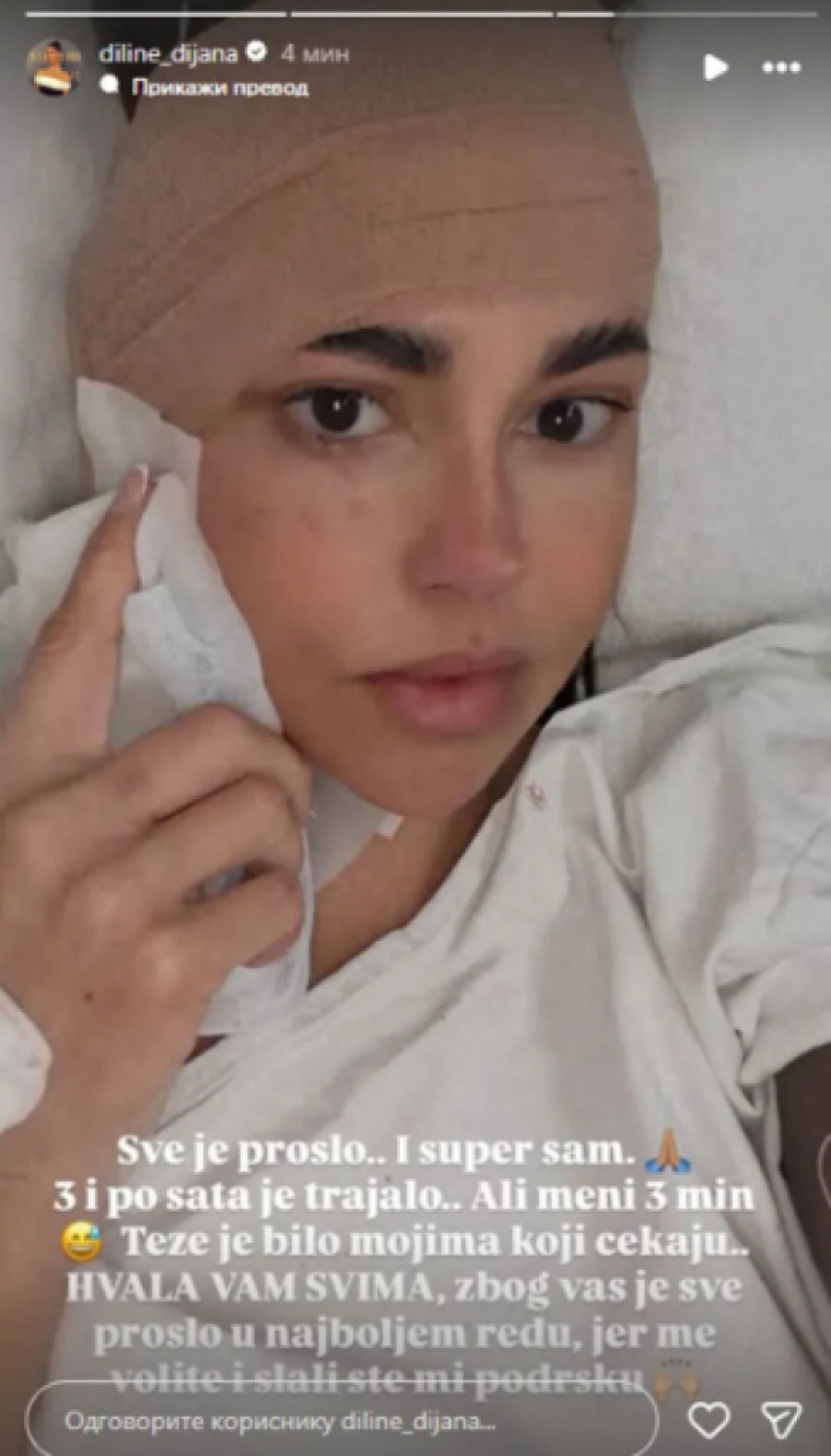 - Sve je prošlo i super sam. Operacija je trajala tri i po sata, ali meni tri minuta. Teže je bilo mojima, koji čekaju. Hvala vam svima - napisala je Radonjićeva uz fotografiju na kojoj se vidi sa zavijenom glavom, dok gazu drži na licu.