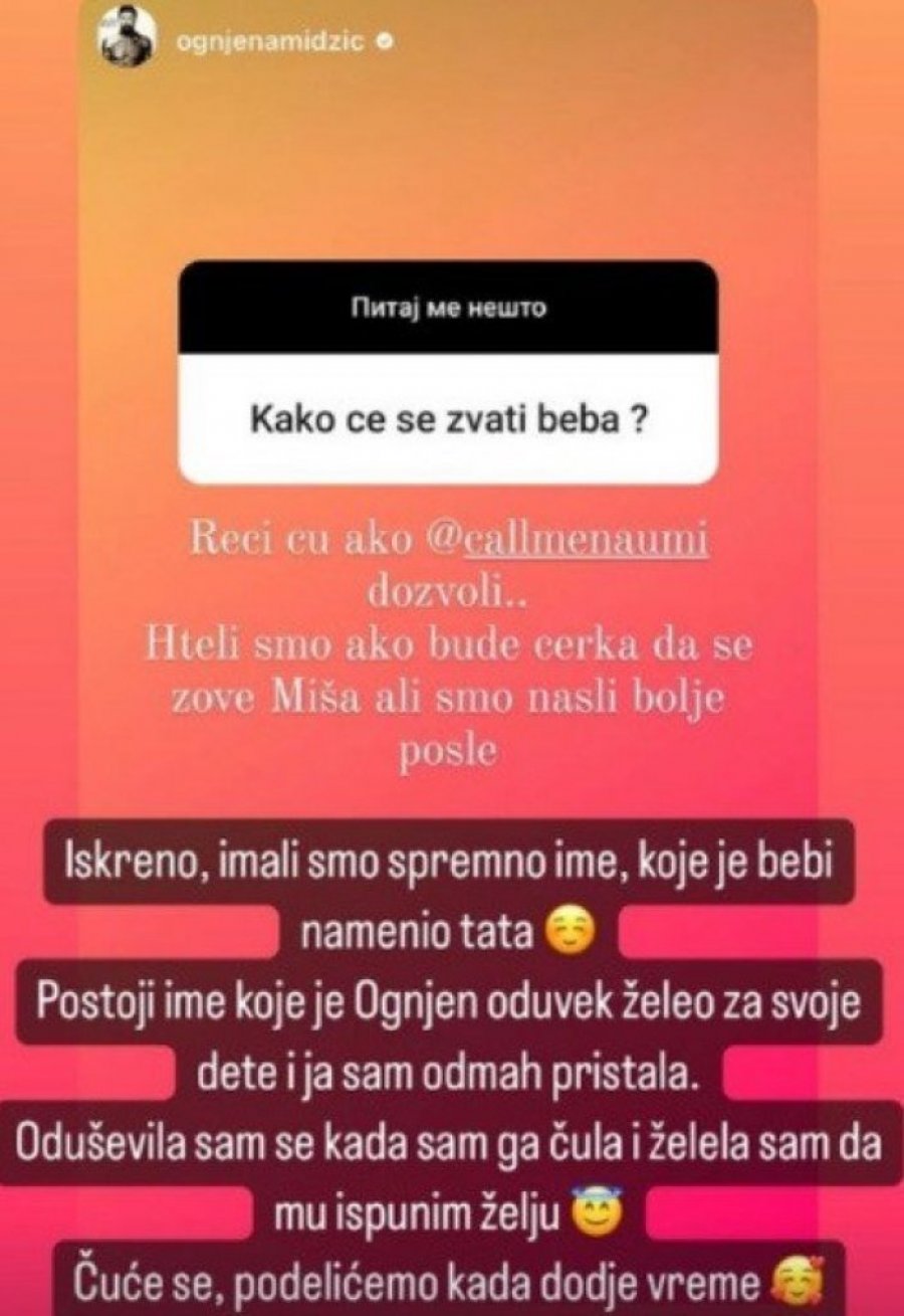 – Iskreno, imali smo spremno ime koje je bebi namenio tata. Postoji ime koje je Ognjen oduvek želeo za svoje dete i odmah sam pristala. Oduševila sam se kada sam ga čula i želela sam da mu ispunim želju. Čuće se, podelićemo kada dođe vreme – napisala je Mina.