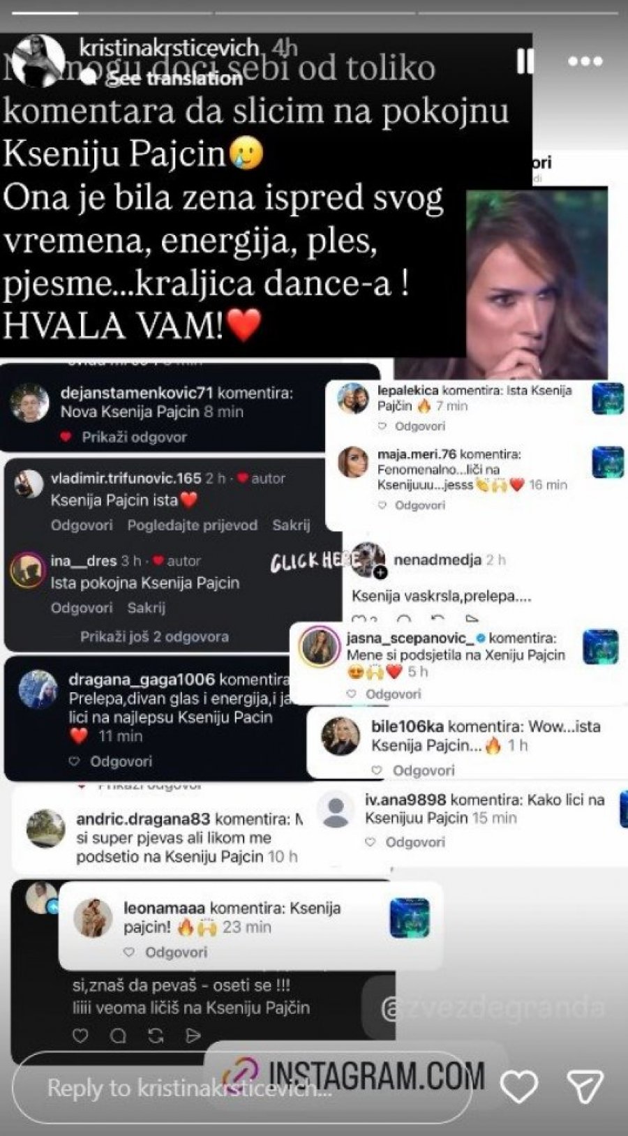 - Ne mogu da dođem sebi od toliko komentara da ličim na pokojnu Kseniju Pajčin. Ona je bila žena ispred svog vremena, energija, ples, pesme, kraljica densa! Hvala vam!