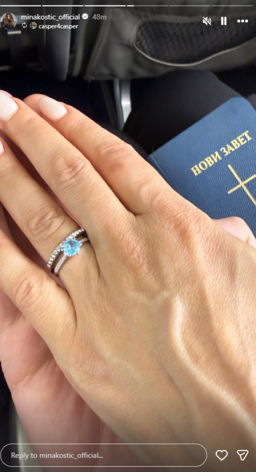 Mina se na svom Instagram profilu oglasila i podelila fotografije sa puta. Prvo je objaviloa fotografiju iz aviona. U prvom planu nalayio se verenički prsten i Manetova ruka, a u pozadini je bila Biblija.