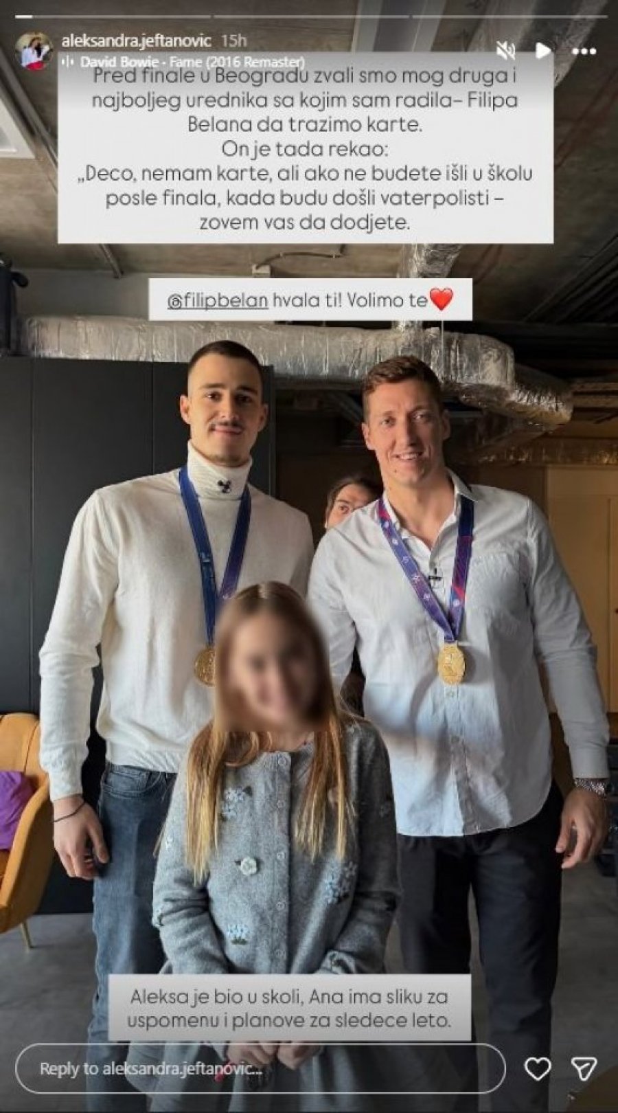Aleksandra Jeftanović ispunila je veliku želju svojoj ćerkici Ani, odvevši je na jednu televiziju kako bi uživo upoznala zlatne vaterpoliste Srbije, koji su nakon trijumfa u finalu gostovali u programu. Voditeljka je otkrila da njen sin Aleksa tog dana nije mogao da dođe jer je bio u školi, ali je zato Ana imala priliku da upozna svoje sportske heroje i doživi trenutak koji će dugo pamtiti.
