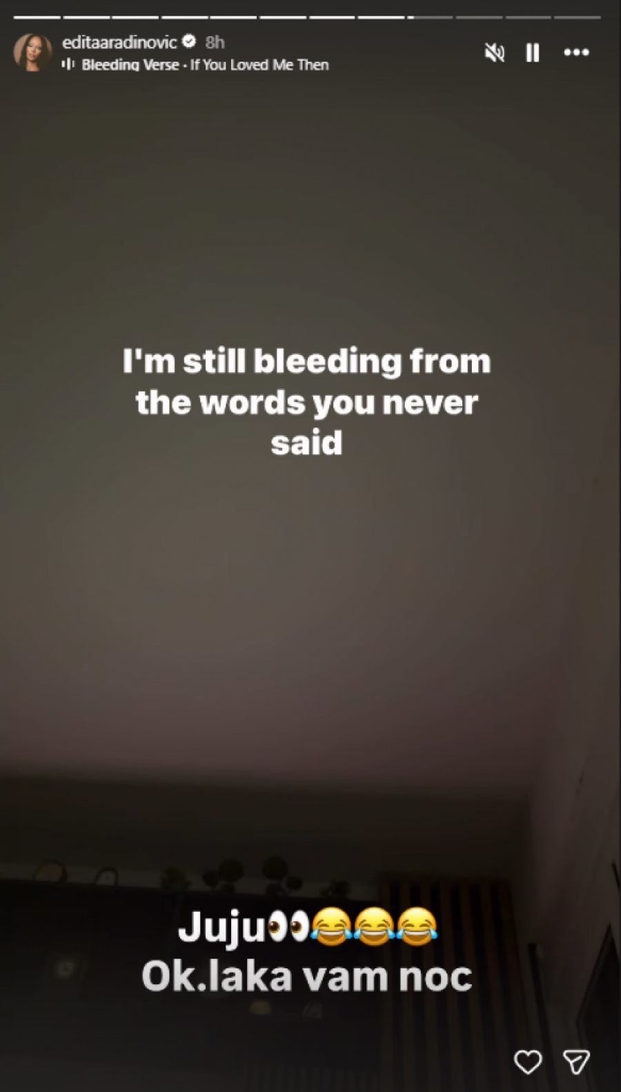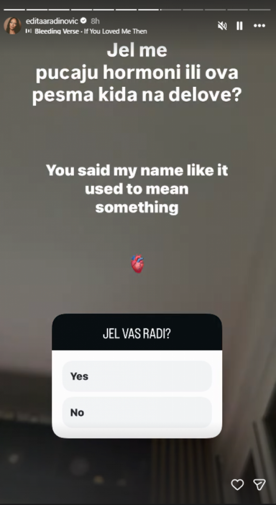 - Je l' me pucaju hormoni ili ova pesma kida na delove? - napisala je Edita uz pesmu "If You Loved Me Then", pa dodala: