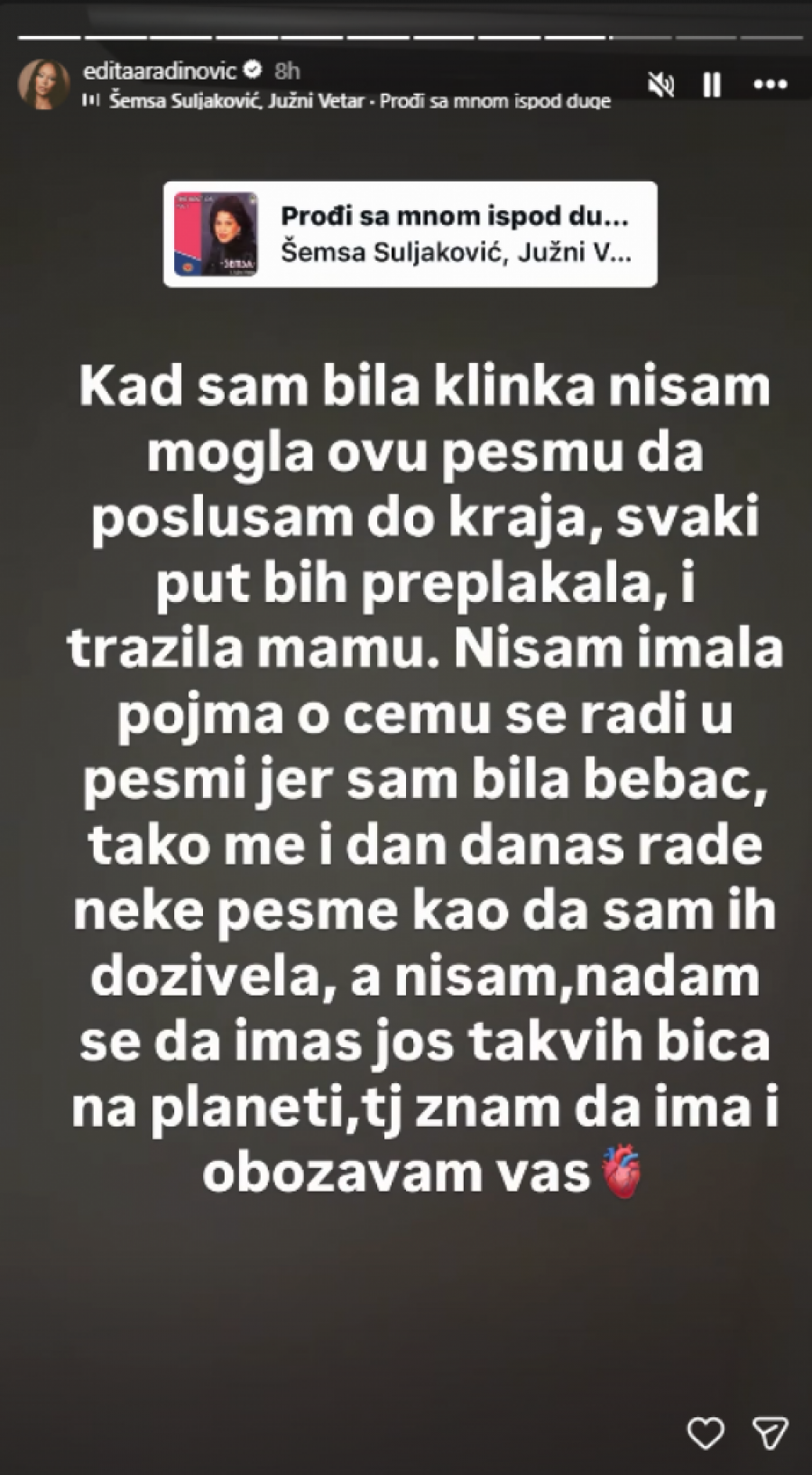 - Kad sam bila klinka nisam mogla ovu pesmu da poslušam do kraja, svaki put bih preplakala i tražila mamu. Nisam imala pojma o čemu se radi u pesmi jer sam bila bebac, tako me i dan-danas rade neke pesme kao da sam ih doživela, a nisam, nadam se da imaš još takvih bića na planeti, tj. znam da ima i obožavam vas - napisala je.