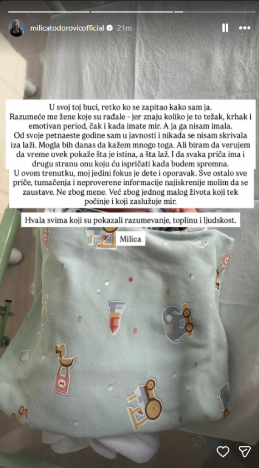U ovom trenutku, moj jedini fokus je dete i oporavak. Sve ostalo, sve priče, tumačenja i neproverene informacije najiskrenije molim da se zaustave. Ne zbog mene. Već zbog jednog malog života koji tek počinje i koji zaslužuje mir.