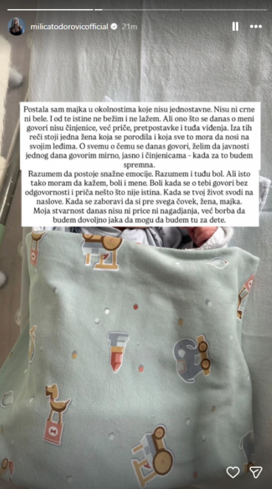 Postala sam majka u okolnostima koje nisu jednostavne. Nisu ni crne ni bele. I od te istine ne bežim i ne lažem. Ali ono što se danas o meni govori nisu činjenice, već priče, pretpostavke i tuđa viđenja. Iza tih reči stoji jedna žena koja se porodila i koja sve to mora da nosi na svojim leđima. O svemu o čemu se danas govori, želim da javnosti jednog dana govorim mirno, jasno i činjenicama - kada za to budem spremna.
