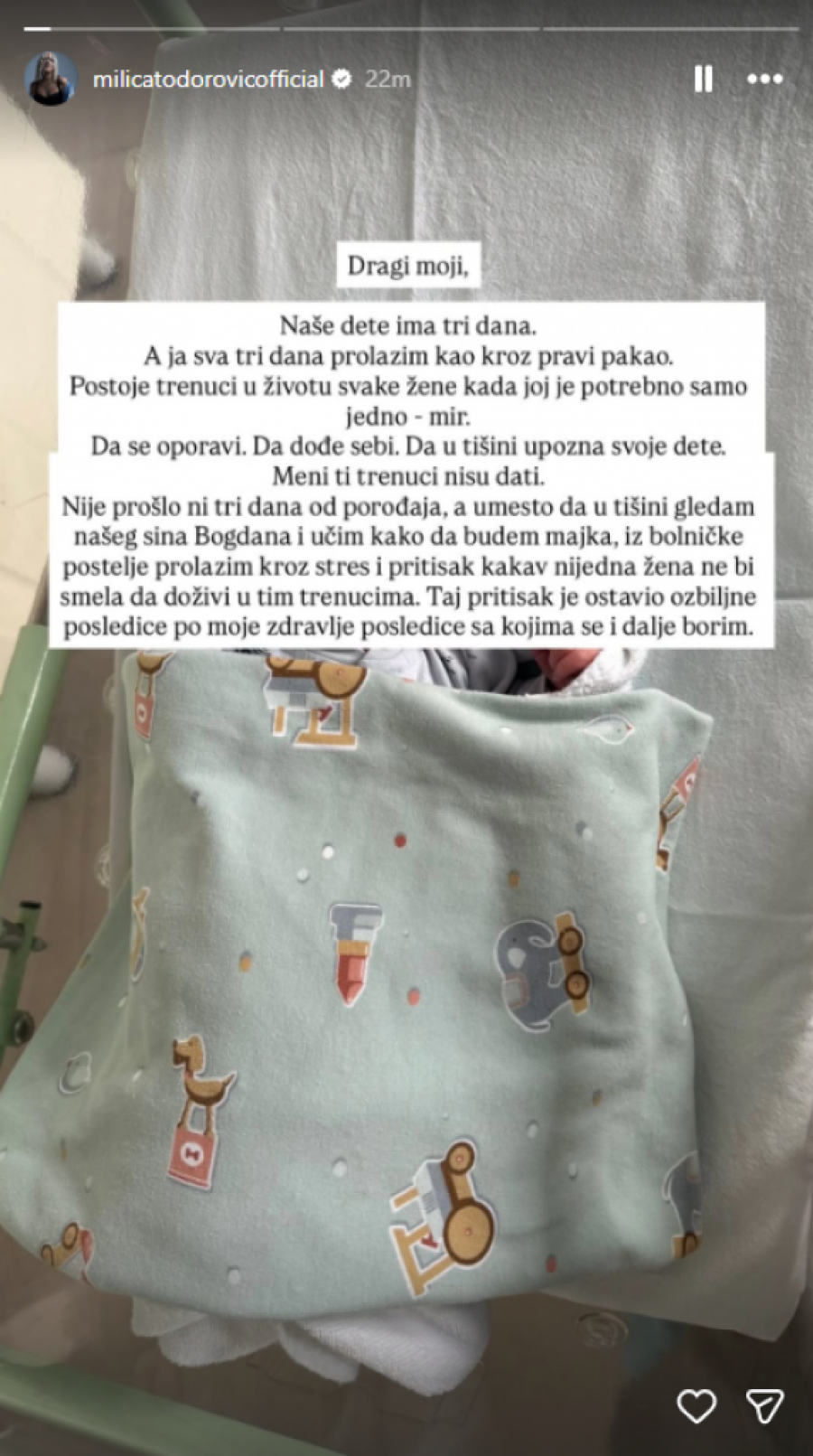 Pevačica Milica Todorović večeras, 6. februara, putem zvaničnog saopštenja objavila je prve fotografije svog sina Bogdana iz porodilišta. Njegovo lice na slici prekrila je saopštenjem koje je uputila javnosti, u kojem otvoreno govori o teškim trenucima kroz koje prolazi kao nova majka.