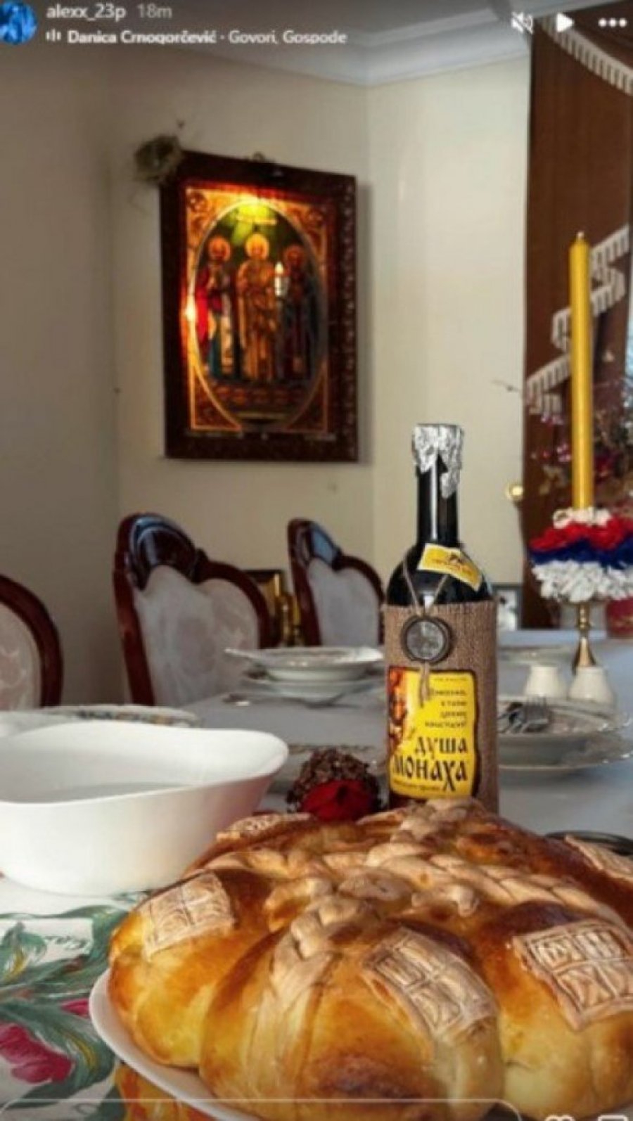 Aleksandra je na Instagramu objavila fotografije iz porodične kuće na kojima se vidi spreman slavski sto, tradicionalni slavski kolač, ikona na zidu, sveća, vino i praznične salvete — simboli kojima se poštuje porodična tradicija i sećanje na Sašu Popovića.
